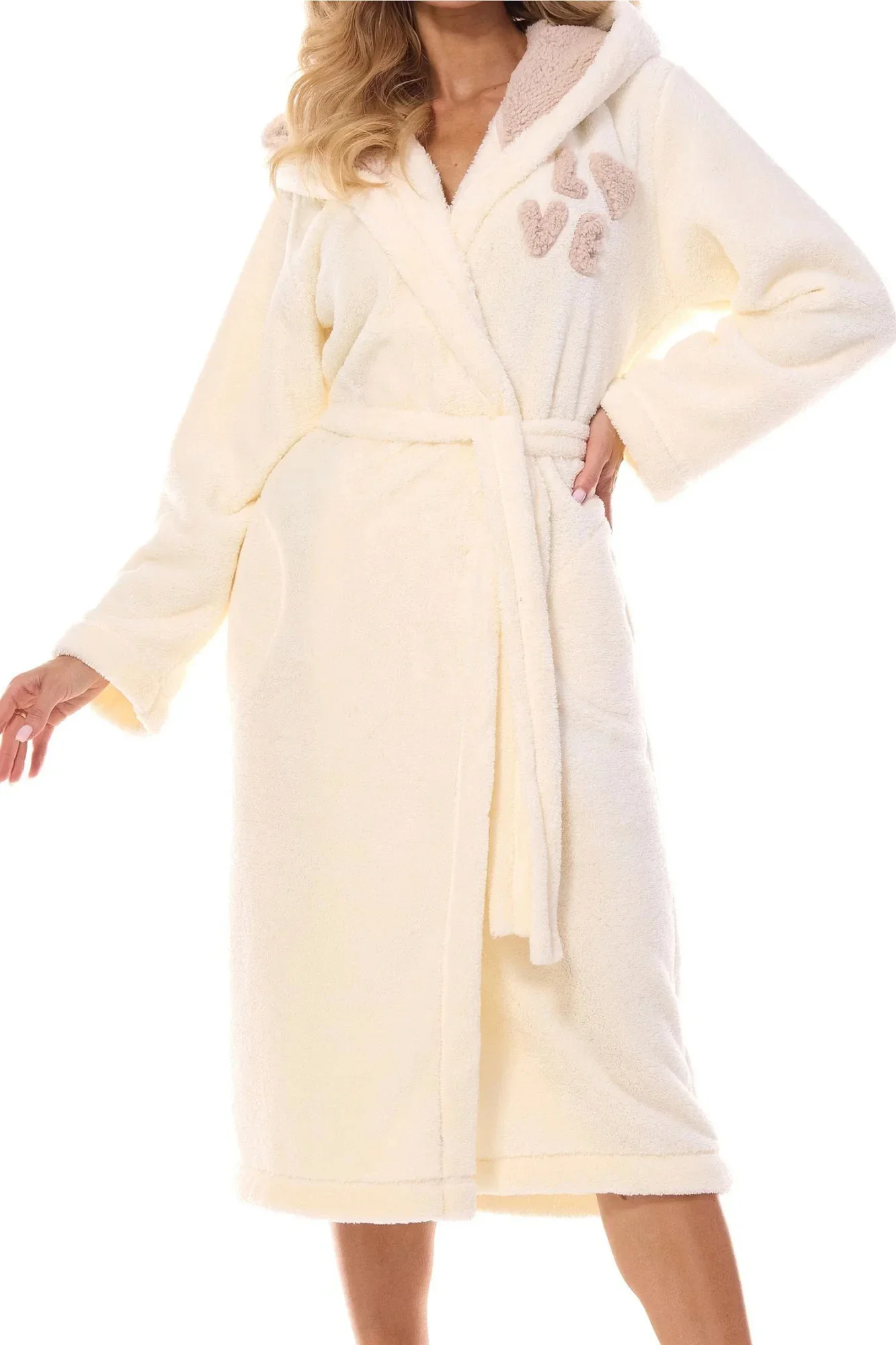 Dámský župan 2410 LV cream L&L - krémová barva - z měkkého materiálu typu soft - s potiskem - na prsou ozdobná výšivka - dlouhé rukávy zakončené manžetami - kapsy na bocích - s kapucí - v pase vázání na pásek - dlouhý