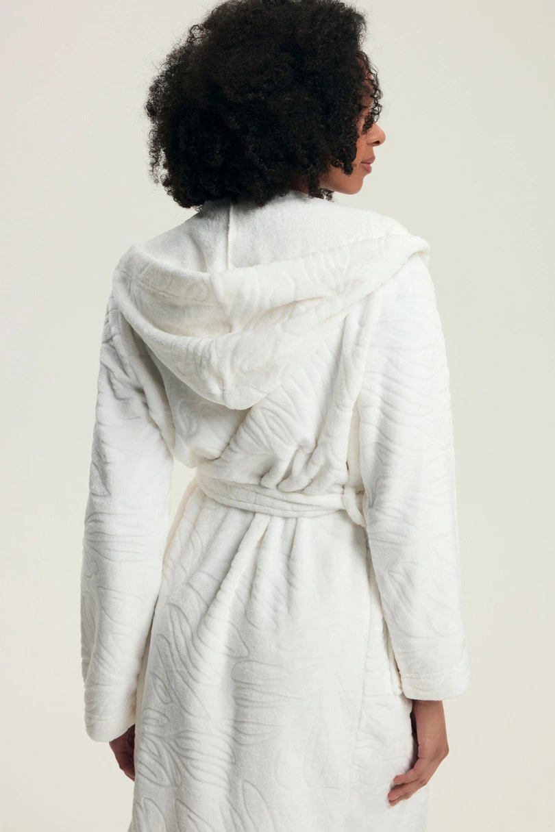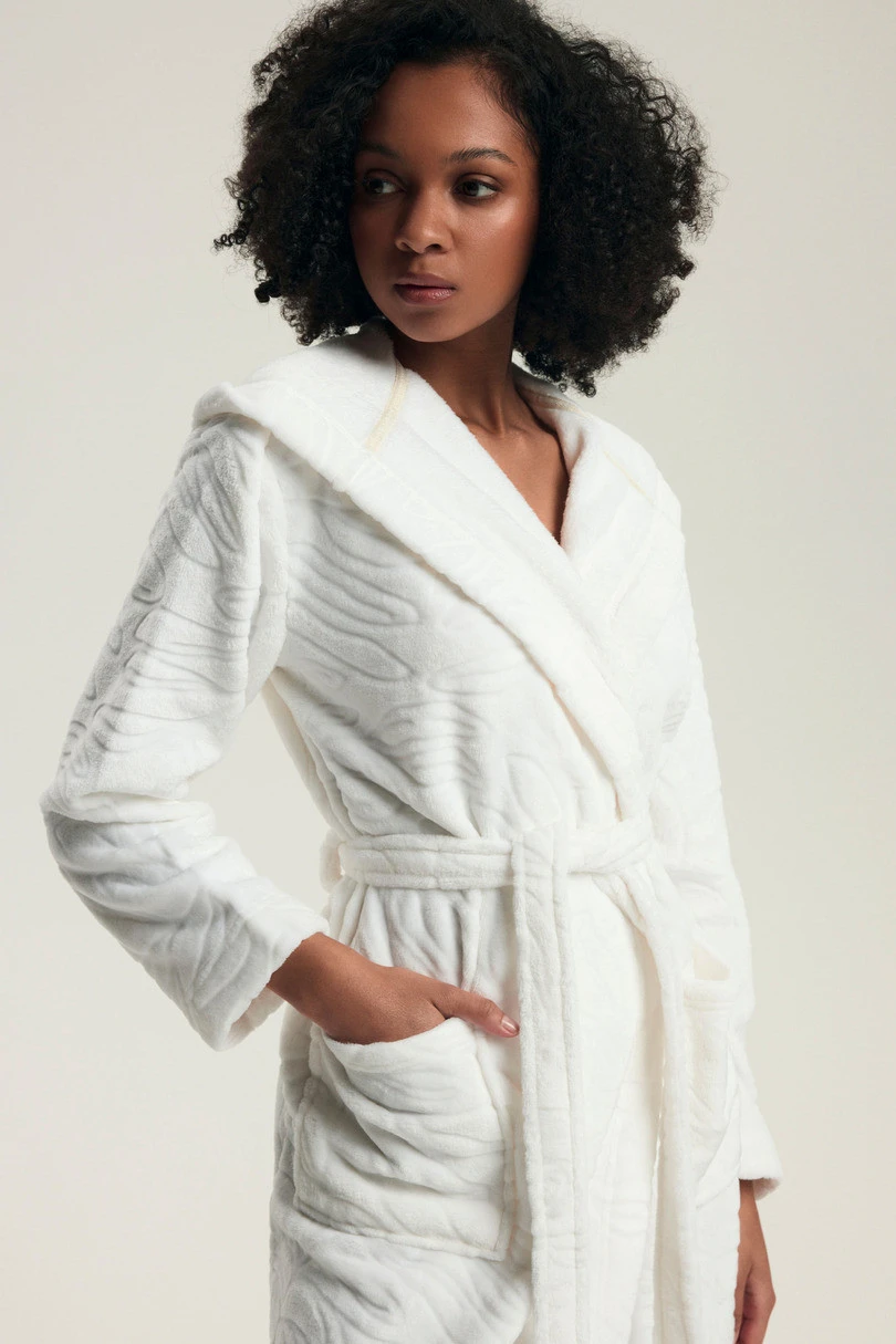 Szlafrok damski DARYL 43612 AW25 to idealne połączenie elegancji, wygody i nietuzinkowego designu. Wykonany z niezwykle miękkiego materiału z tłoczeniem w dekoracyjny wzór, przyciąga wzrok i zapewnia luksusowe doznania podczas noszenia. Model posiada praktyczny kaptur, głębokie kieszenie oraz pasek w talii, który podkreśla sylwetkę i umożliwia wygodne dopasowanie. Dostępny w dwóch pięknych kolorach – głębokim odcieniu kawy oraz klasycznej bieli – świetnie sprawdzi się na co dzień oraz jako elegancki prezent.