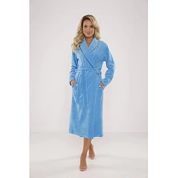 Dlouhý, pohodlný dámský župan s šálovým límcem. Ušitý je z příjemného veluru. Má kapsy a v pase je na zavázání. Obšitý kontrastními lemy.