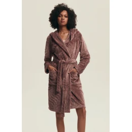 Szlafrok damski DEVYN 43602 AW25 to doskonała propozycja dla kobiet ceniących wygodę, elegancję i nowoczesne wzornictwo. Wykonany z wyjątkowo miękkiego materiału o geometrycznym tłoczeniu, zapewnia przyjemne ciepło i stylowy wygląd. Wyposażony w duży kaptur, pojemne kieszenie i pasek do przewiązania w talii, łączy w sobie funkcjonalność z subtelną kobiecością. Dostępny w modnych, pudrowych odcieniach, będzie idealnym towarzyszem poranków, wieczorów i chwil relaksu w domowym zaciszu.