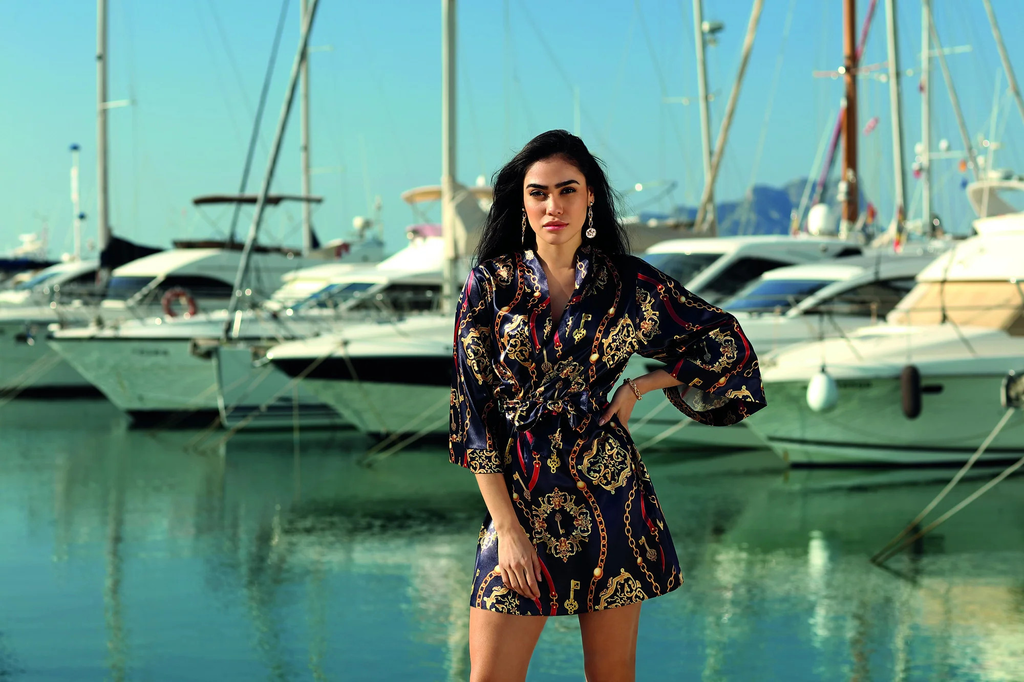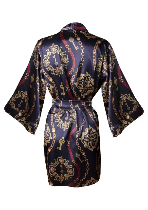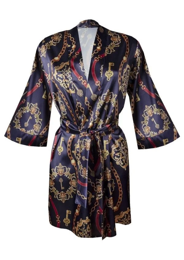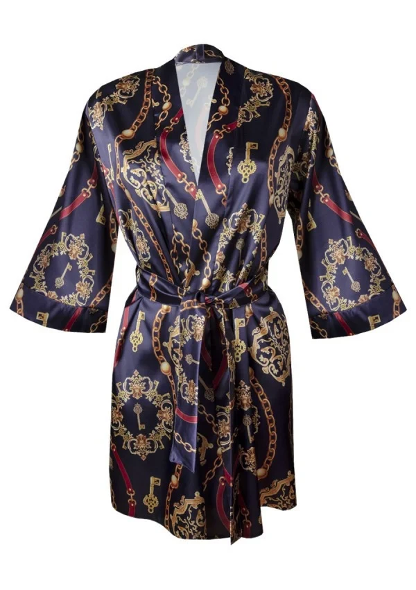 Výrazný a výrazný vzor, tmavší barvy a satén - kombinace, která vzbuzuje zájem. Tuto spodní sukni si můžete obléknout, kdykoli budete mít chuť si odpočinout a uvolnit se. 3/4 rukávy, zavazování v pase, délka do poloviny stehen. Takže ranní káva nebo večer s dobrou knihou? - v tomto plášti můžete dělat obojí. Složení: 100% polyester.