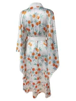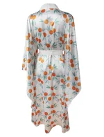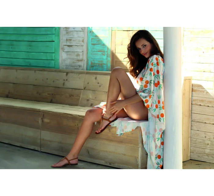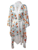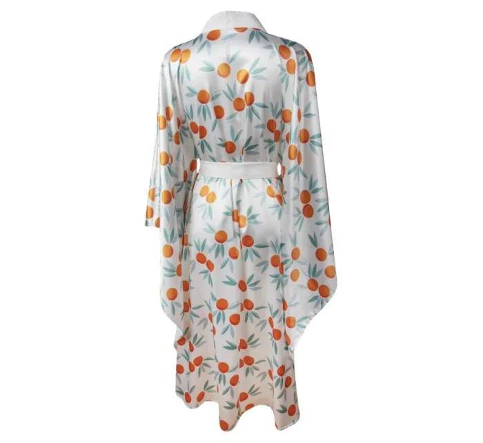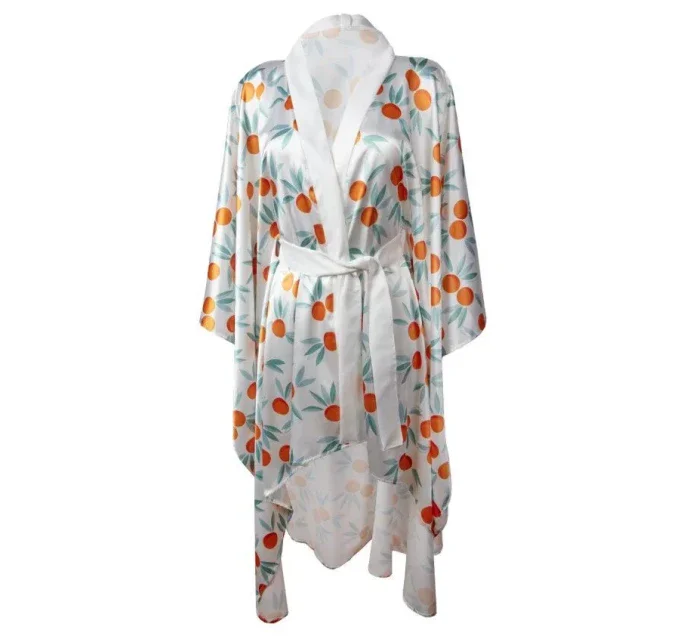 Krásný saténový župan z nejnovější kolekce DKaren, který vám umožní užívat si léto po celý rok. Přední díl županu je lemován bílou lemovkou, v pase se zavazuje na bílou vázačku, střih je asymetrický, vpředu kratší a vzadu delší, rukávy jsou kimonového střihu. 100% polyester.