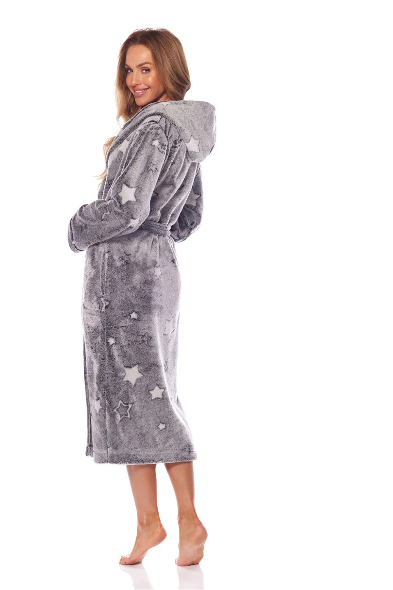 Dlouhý dámský župan z hřejivého měkkého úpletu s kapucí. Kapsy na úrovni boků, zavazování v pase.