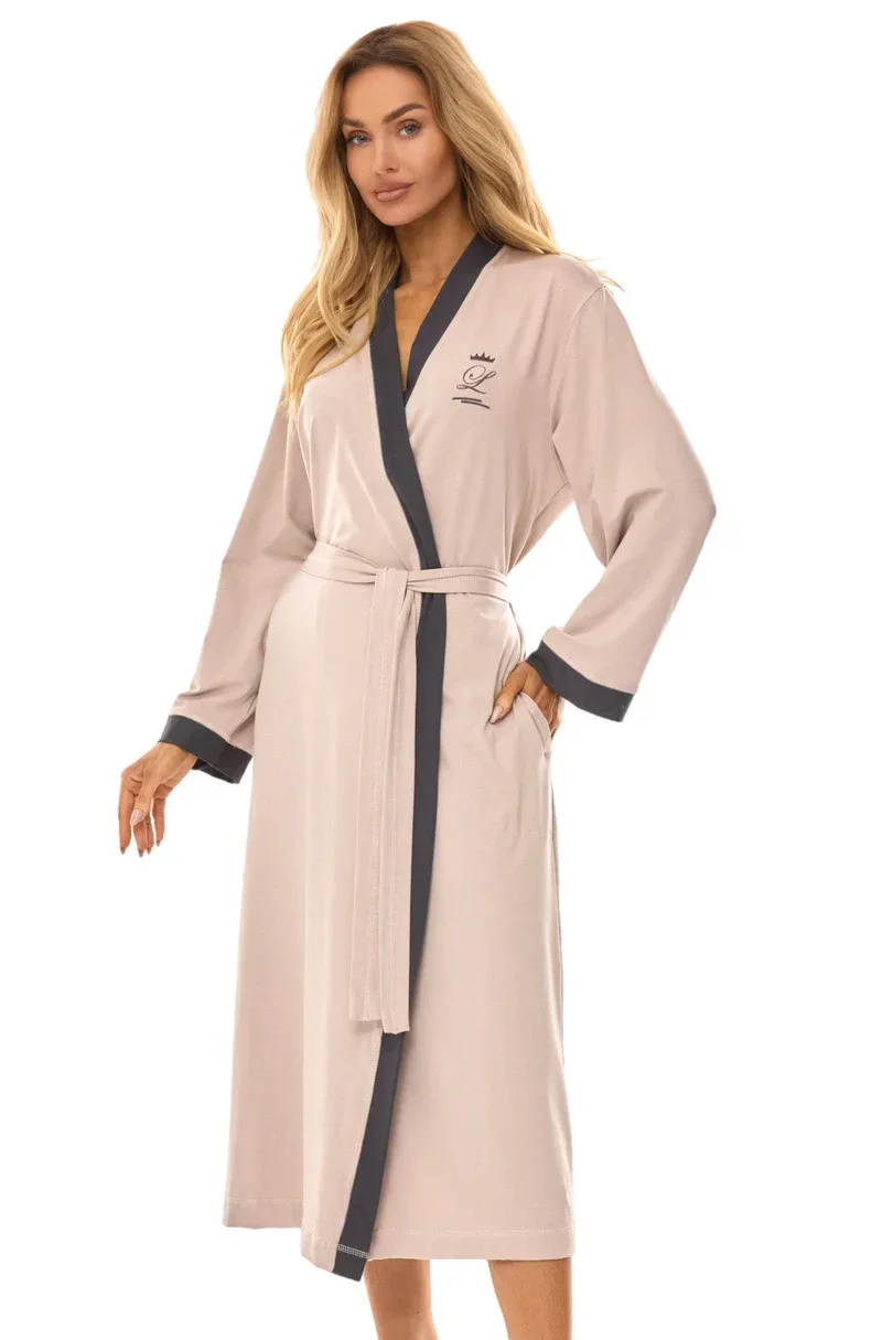 Ten długi szlafrok damski to połączenie subtelności, wygody i wyrafinowanego stylu. Wykonany z wysokogatunkowej, cienkiej dzianiny wiskozowej, zapewnia maksymalny komfort noszenia i lekkość tkaniny, która idealnie układa się na sylwetce. Kontrastowe obszycia mankietów i poł przednich dodają całości nowoczesnego charakteru, a delikatny haft na piersi podkreśla kobiecy detal. Długi rękaw, wiązanie w pasie oraz praktyczne kieszenie na biodrach czynią ten model funkcjonalnym i eleganckim rozwiązaniem na domowy wypoczynek, poranki lub wieczory. Idealny również jako prezent.