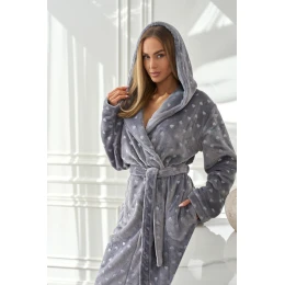 Szlafrok damski 2551 to wyjątkowe połączenie wygody, ciepła i subtelnego uroku. Wykonany z miękkiej dzianiny ozdobionej delikatnymi, połyskującymi serduszkami, zachwyca swoim kobiecym charakterem. Długi fason z praktycznym kapturem oraz długimi rękawami doskonale sprawdzi się w chłodniejsze dni. Wiązanie w pasie pozwala na idealne dopasowanie do sylwetki, a wygodne kieszenie na biodrach zapewniają dodatkowy komfort. To doskonały wybór na wieczorny relaks, poranne rytuały czy jako elegancki prezent.