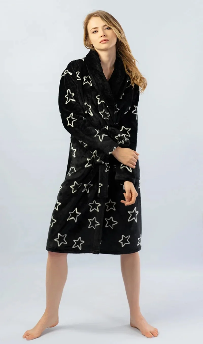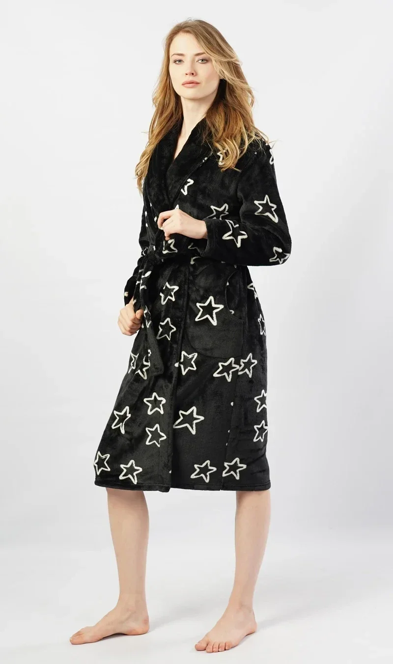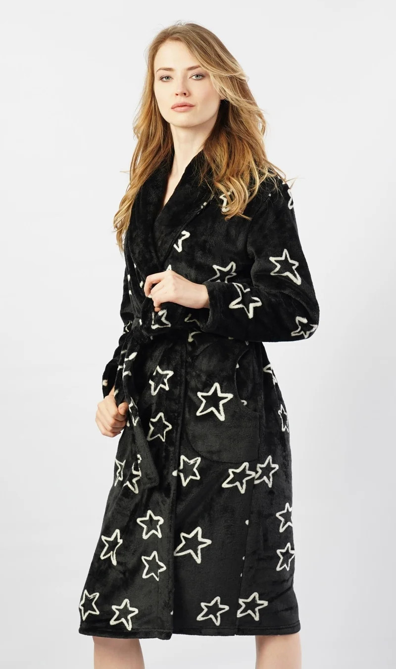 Dámský župan dlouhý s Hvězdy. Hřejivý dámský župánek je potištěn obrysy hvězd. Župan má šálový límec, pásek ke stažení a praktické kapsy. Použitý softový materiál je jemný a poddajný na dotek.