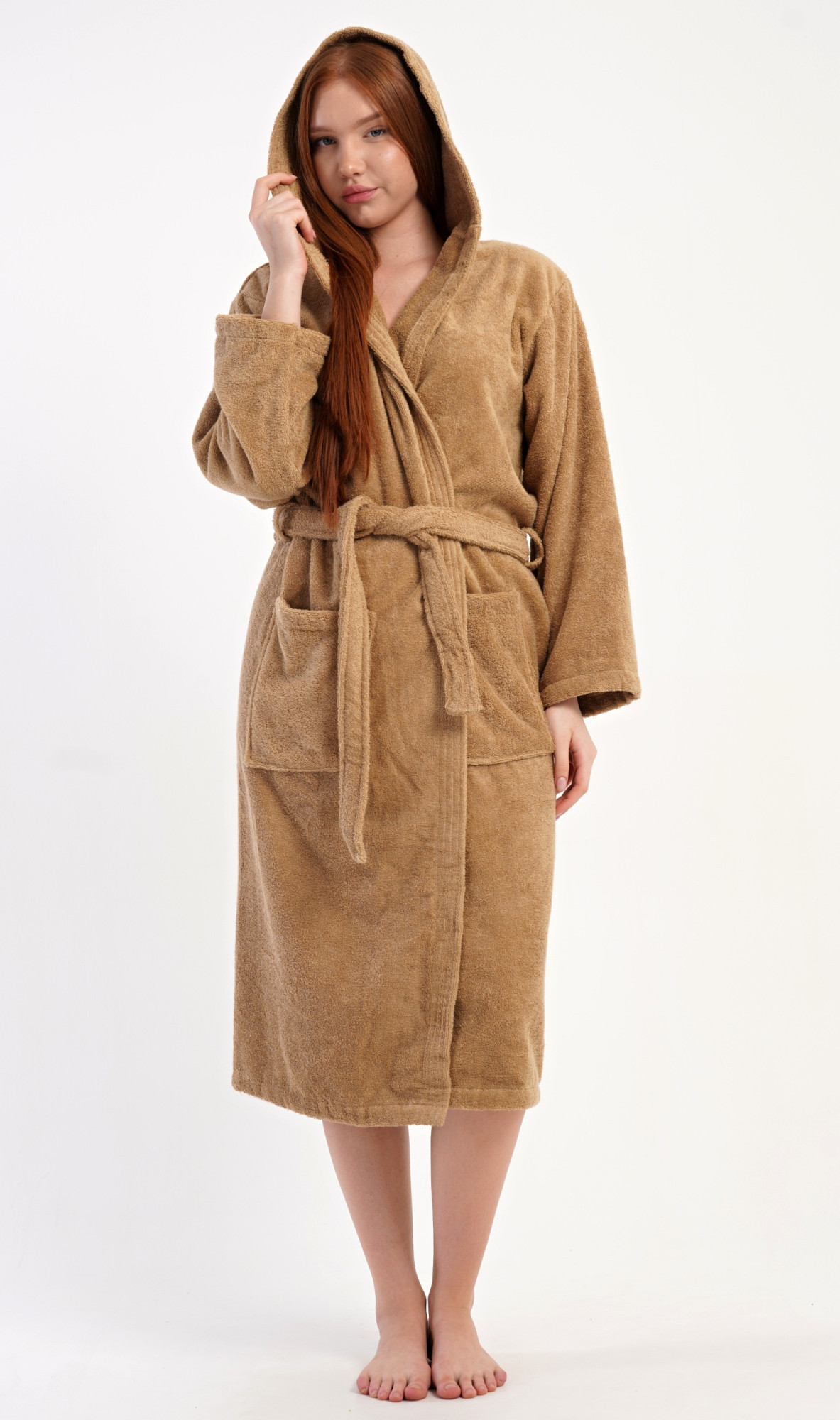 Dámský bavlněný froté župan s kapucí Karamelka. Dámský dlouhý župan s kapucí a páskem ke stažení je vhodný po koupeli i na povalování se doma na gauči. Froté župan má praktické kapsy, které oceníte při návštěvě wellness. Použitý bavlněný materiál je příjemný a poddajný na dotek.