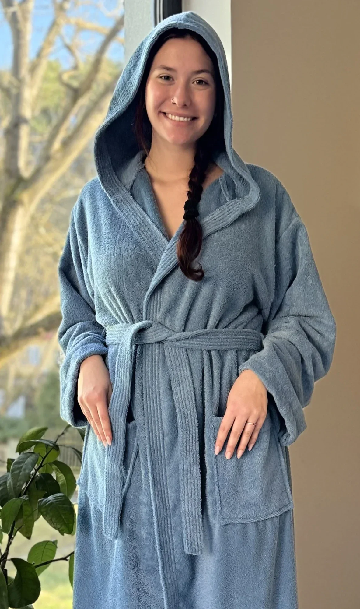 Dámský bavlněný froté župan s kapucí Klára. Dámský dlouhý župan s kapucí a páskem ke stažení je vhodný po koupeli i na povalování se doma na gauči. Froté župan má praktické kapsy, které oceníte při návštěvě wellness. Použitý bavlněný materiál je příjemný a poddajný na dotek.