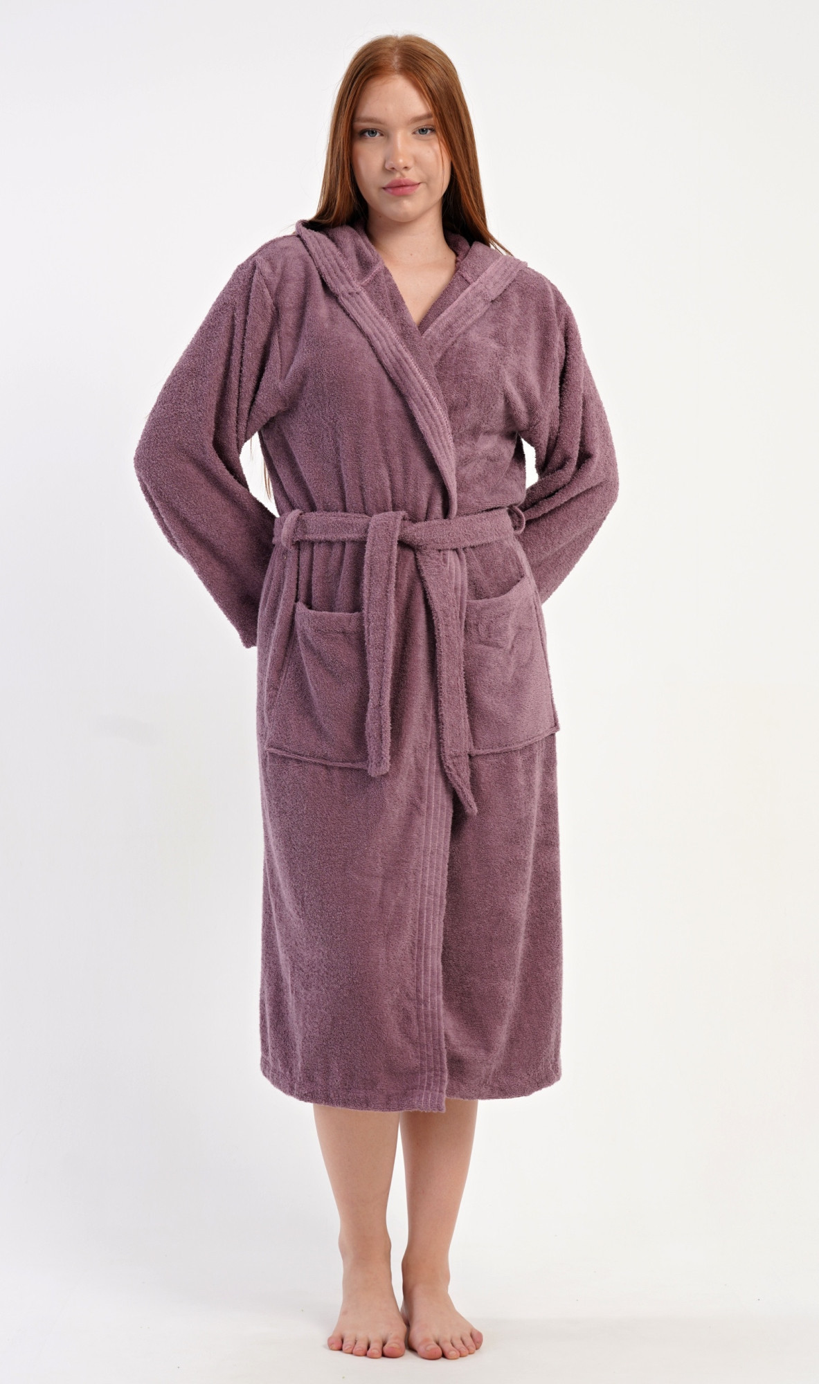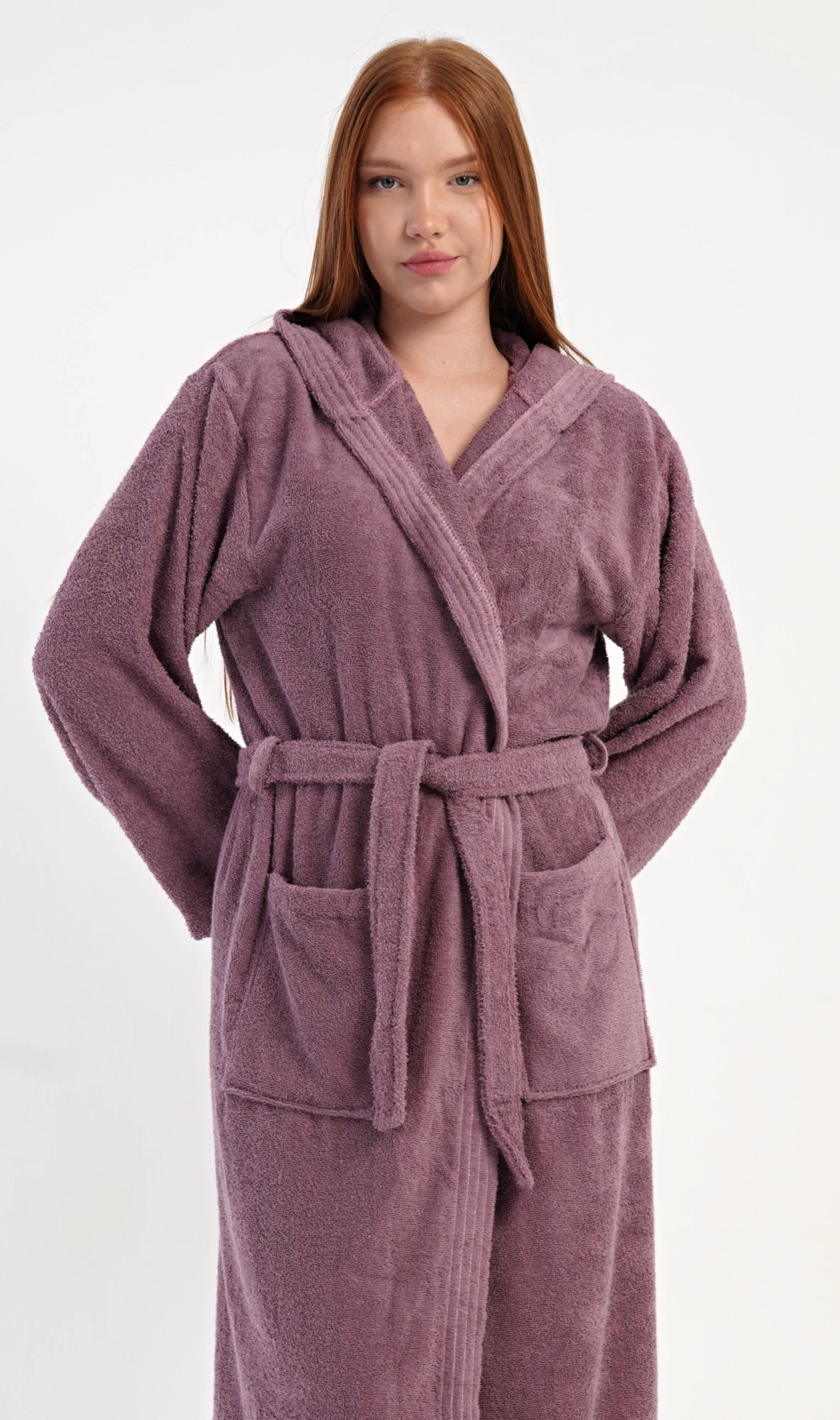 Dámský bavlněný froté župan s kapucí Vřes. Dámský dlouhý župan s kapucí a páskem ke stažení je vhodný po koupeli i na povalování se doma na gauči. Froté župan má praktické kapsy, které oceníte při návštěvě wellness. Použitý bavlněný materiál je příjemný a poddajný na dotek.