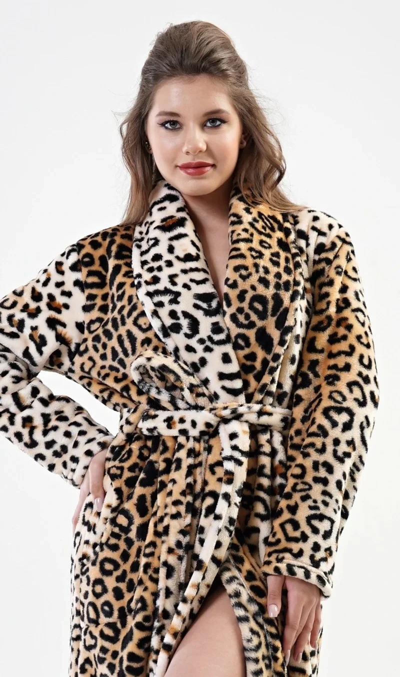 Dámský župan dlouhý se šálovým límcem Laura. Dámský župan dlouhý se šálovým límcem a páskem ke stažení Vás zahřeje po koupeli, i na cestě do postele. Župan je proveden v leopardím potisku. Použitý materiál je jemný a poddajný na dotek. Župan je vhodný na denní nošení.