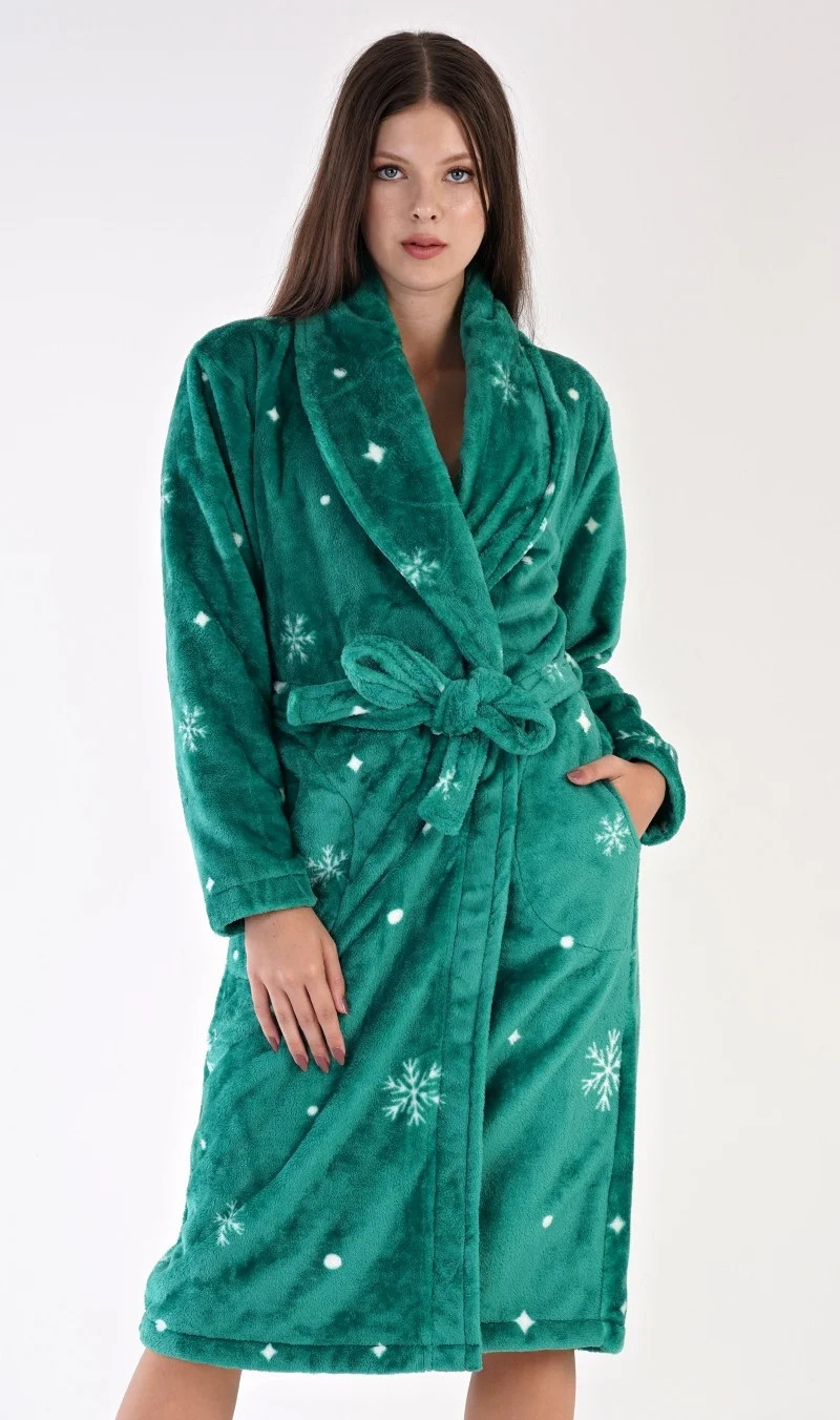 Dámský softový župan dlouhý se šálovým límcem Vločky. Dámský dlouhý župan se šálovým límcem, páskem ke stažení a kapsami je vhodný po koupeli i na povalování se doma na gauči. Župan je potištěný vločkami v kombinaci tmavší zelené a bílé. Použitý softový materiál je jemný, huňatý a poddajný na dotek.