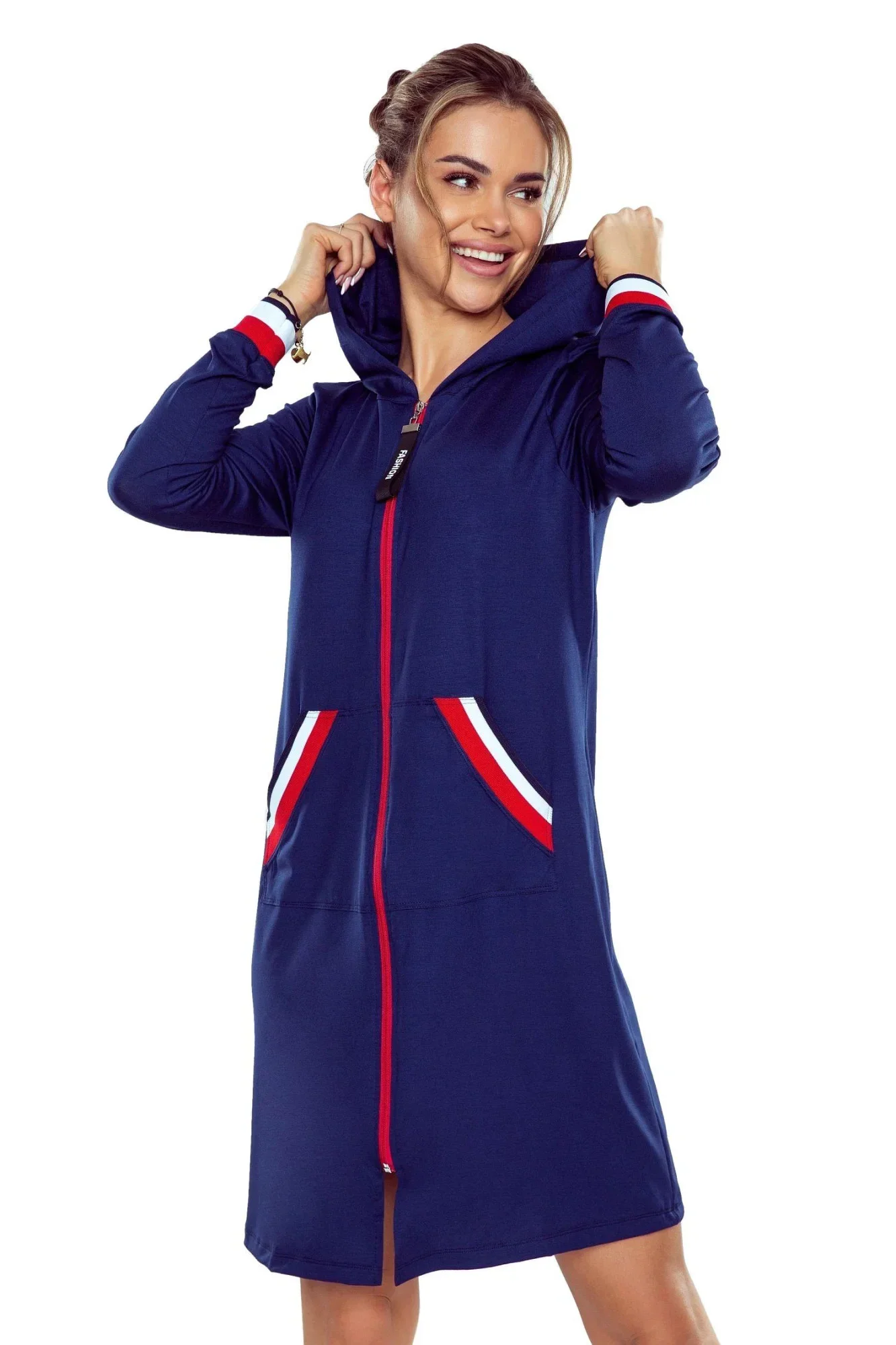 Dámský župan Enia blue ELDAR - tmavě modrá barva - z vysoce jakostní bavlny - dlouhé rukávy - zapínání na zip - kapsy - manžety rukávů a kapsy zakončené barevným stahujícím lemem