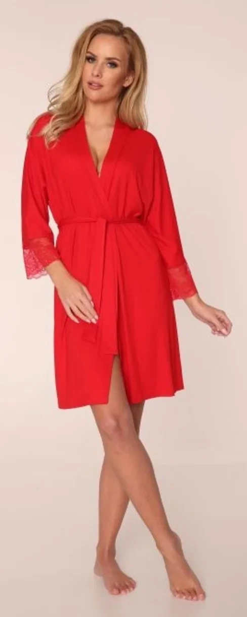 Dámský župan z kvalitní viskozy (94%) a elastanu. Je krátký, v pase na zavázání, se 7/8 rukávy. Manžety jsou zakončené krajkou.