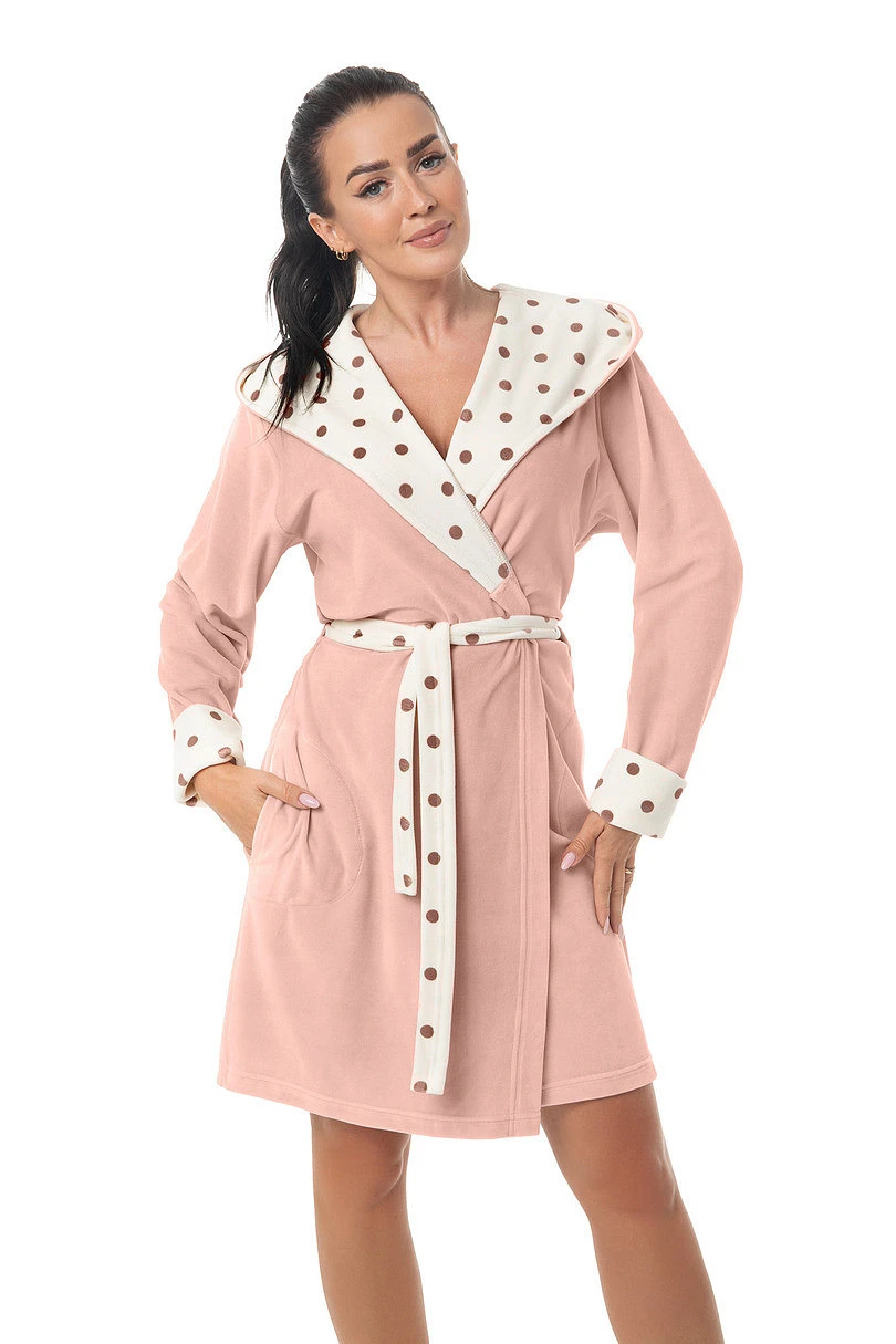 Dámský župan Dorota FR-131 je kombinací funkčnosti, pohodlí a elegantního designu. Je vyroben z vysoce kvalitní tkaniny, kterou z 80 % tvoří měkká a prodyšná bavlna a z 20 % odolný polyester, takže poskytuje teplo a odolnost. Krátký střih s praktickou kapucí je ideální po koupeli i při domácím odpočinku. Model se zavazuje v pase, aby dokonale padl, a kapsy na bocích zvyšují komfort při používání. Kapuce a rukávy jsou zakončeny kontrastní tkaninou, která dodává moderní a stylový charakter.