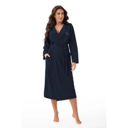 Pohodlný a pohodlný dlouhý dámský župan s límečkem, vyrobený z měkkého úpletu, se stahovací šňůrkou v pase, bočními kapsami a květinovou výšivkou na hrudi.