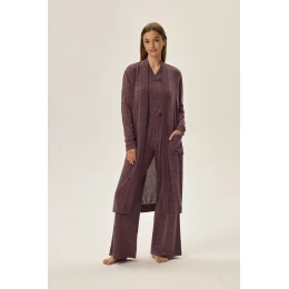 Dlouhý dámský župan vyrobený z měkké melanžové tkaniny.