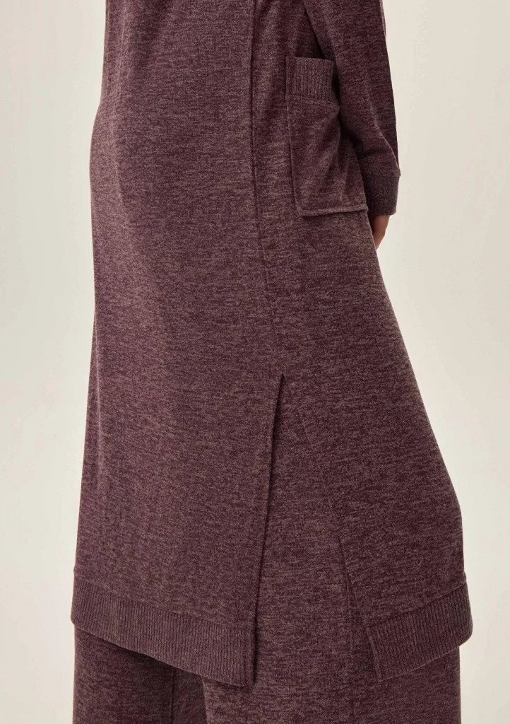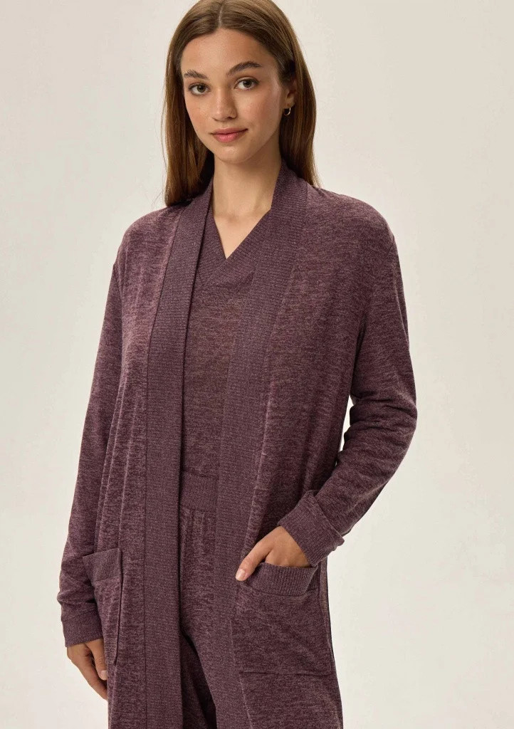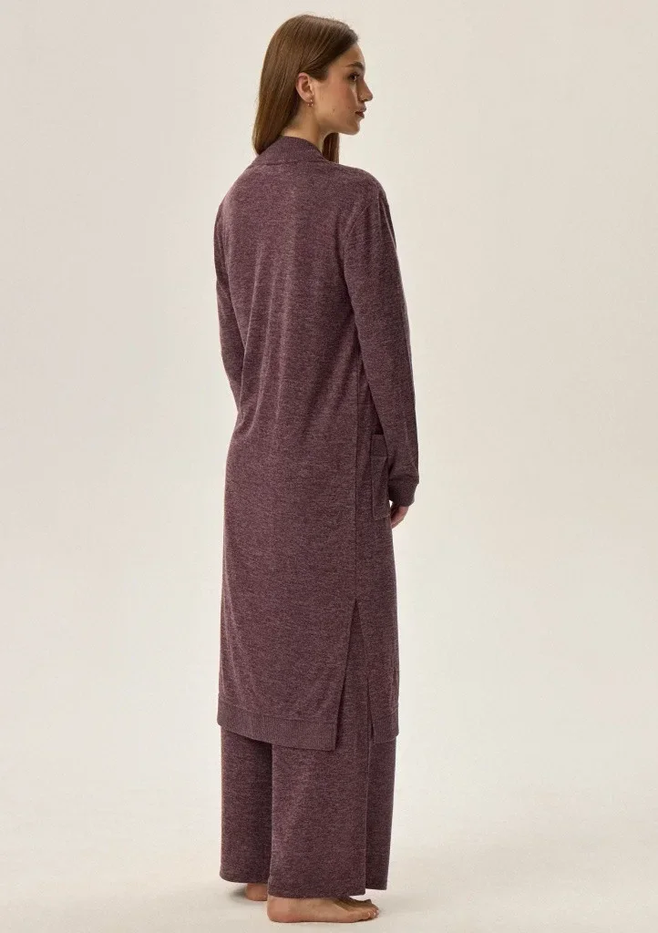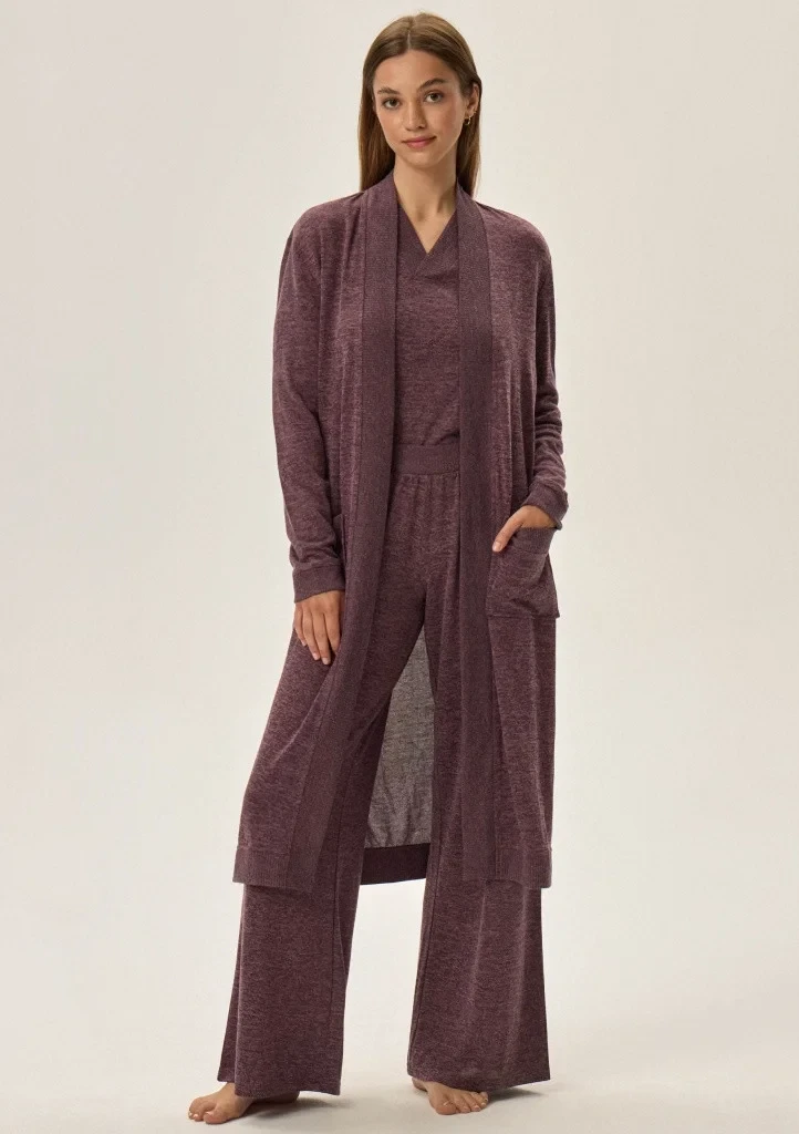 Dámský župan značky Henderson. Župan je dlouhý pod kolena, olemovaný širším lemem, který je také na spodní části županu a kolem rukávů. Župan má na bocích delší rozparky. Župan je volný, na bocích jsou našité kapsy. Dá se také nosit jako dlouhý kardigen.