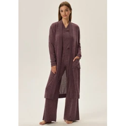 Dámský župan značky Henderson. Župan je dlouhý pod kolena, olemovaný širším lemem, který je také na spodní části županu a kolem rukávů. Župan má na bocích delší rozparky. Župan je volný, na bocích jsou našité kapsy. Dá se také nosit jako dlouhý kardigen.