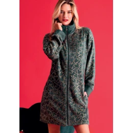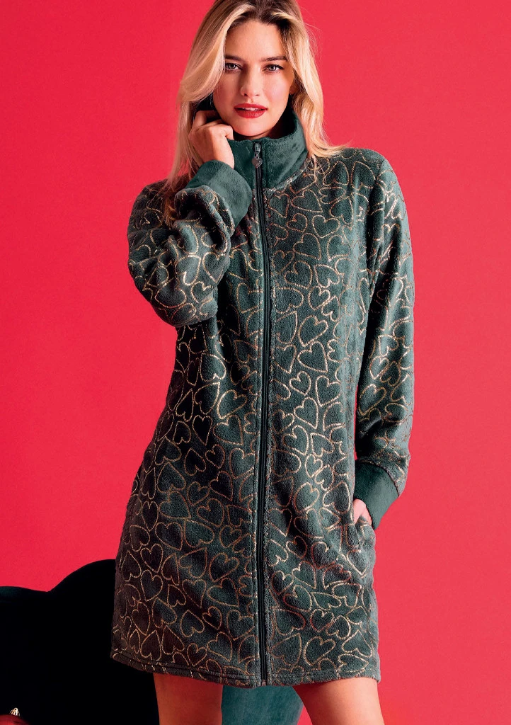 Dámský hřejivý župan Infiore v elegantní tmavě zelené barvě působí luxusně a zároveň útulně. Je vyroben z měkkého fleecového materiálu, který skvěle zahřívá a je velmi příjemný na nošení. Celoplošný vzor zlatých srdíček dodává županu romantický a moderní vzhled. Praktický zip po celé délce, vysoký stojáček a pohodlné kapsy zajišťují maximální komfort. Ideální volba pro zimní večery i domácí pohodu.
