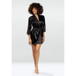 Velmi ženský župan, vyrobený z jemného kvalitního saténu. V černé barvě - jistě zpříjemní nejedno ráno. Za zmínku stojí rukávy - jsou o něco kratší a zdobí je široká, krásná květinová krajka. V pase se zavazuje nahoru. Složení: 100% polyester.