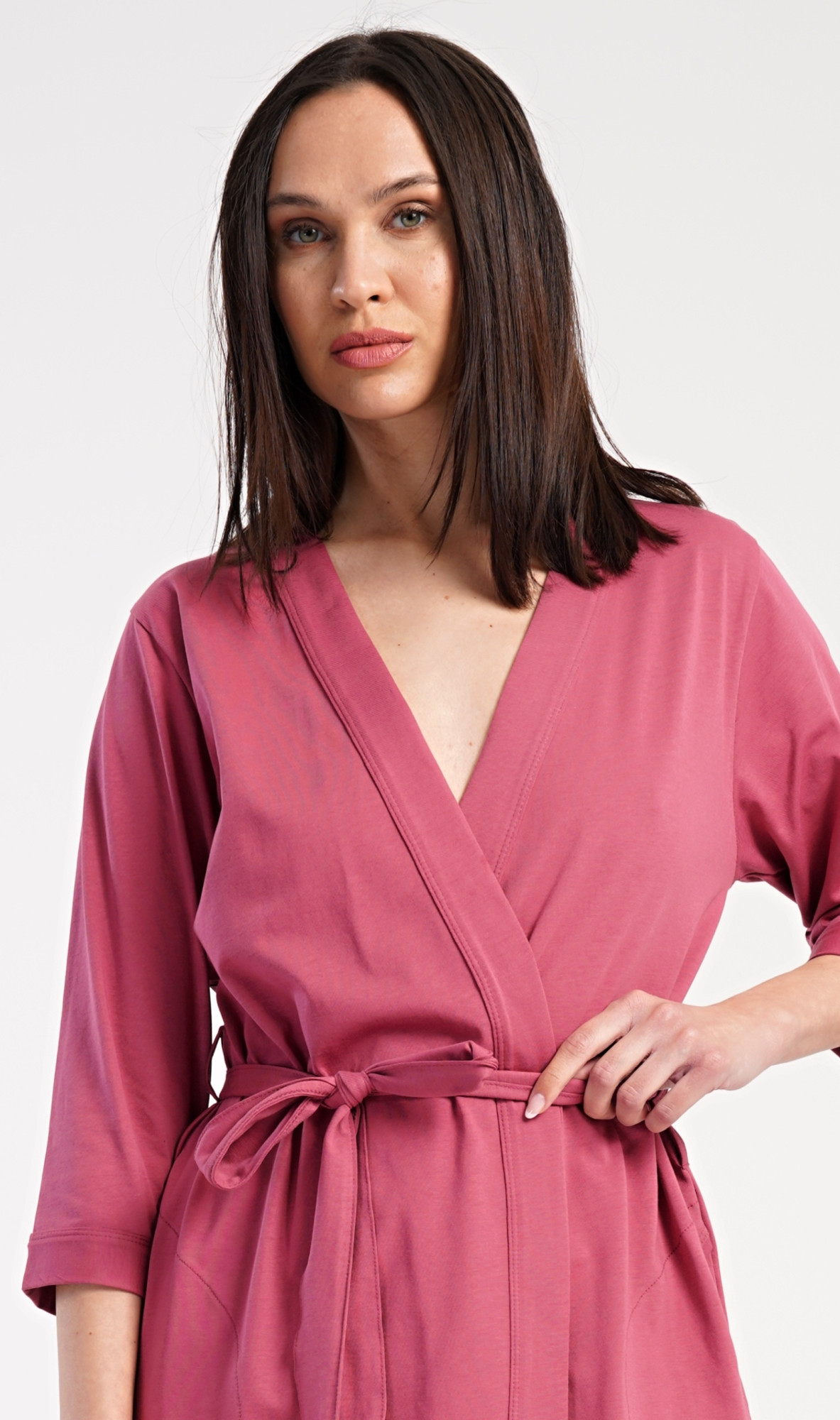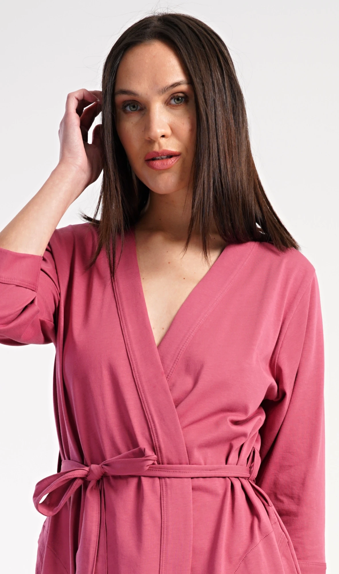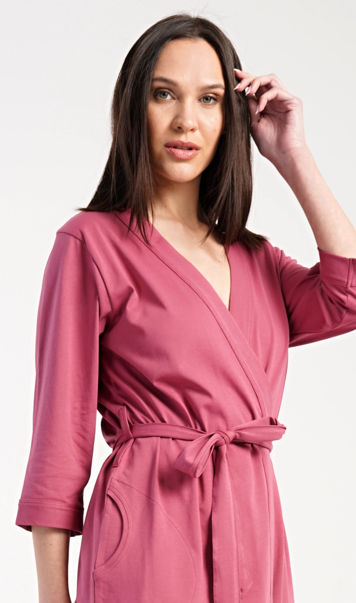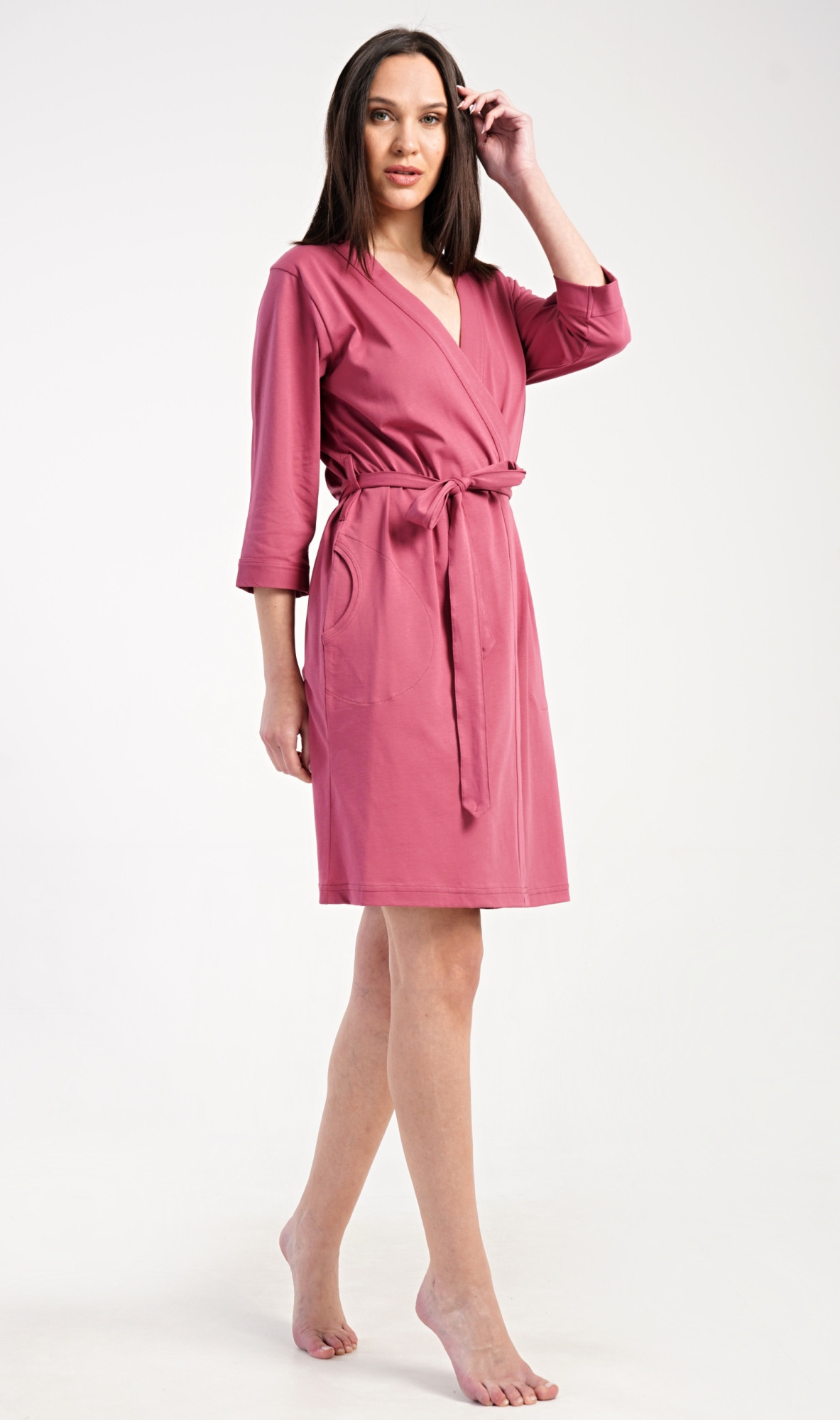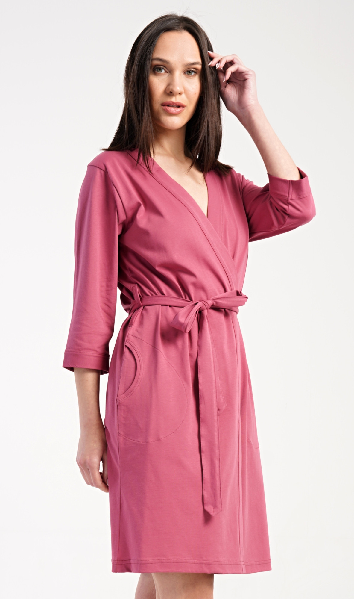 Dámský krátký bavlněný župan Madison. Dámský župánek s tříčtvrtečním rukávem a délkou po kolena má pásek ke stažení a praktické kapsy. Použitý bavlněný materiál je příjemný a poddajný na dotek, saje a oceníte ho i po koupeli.