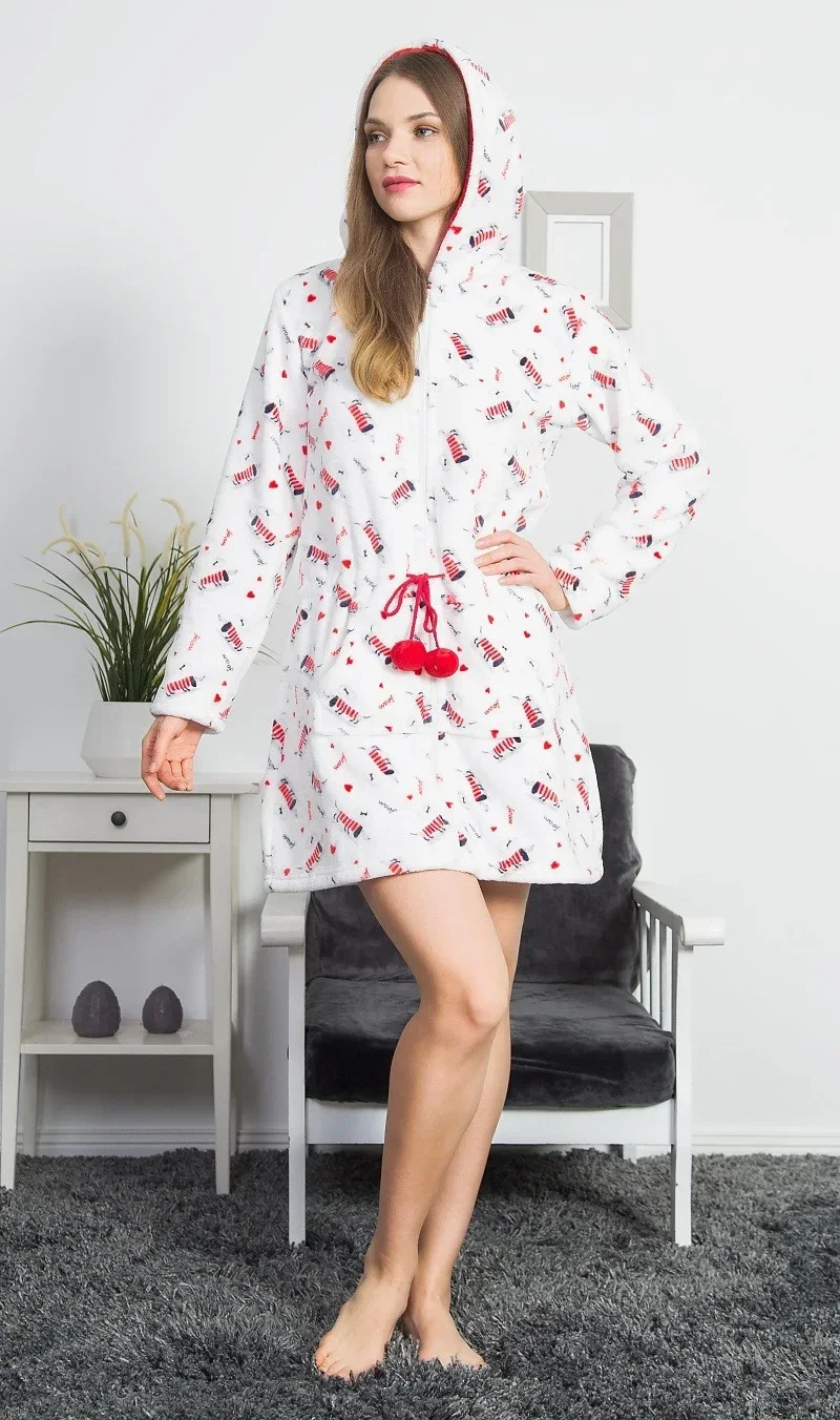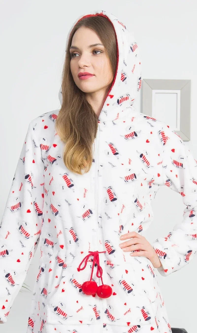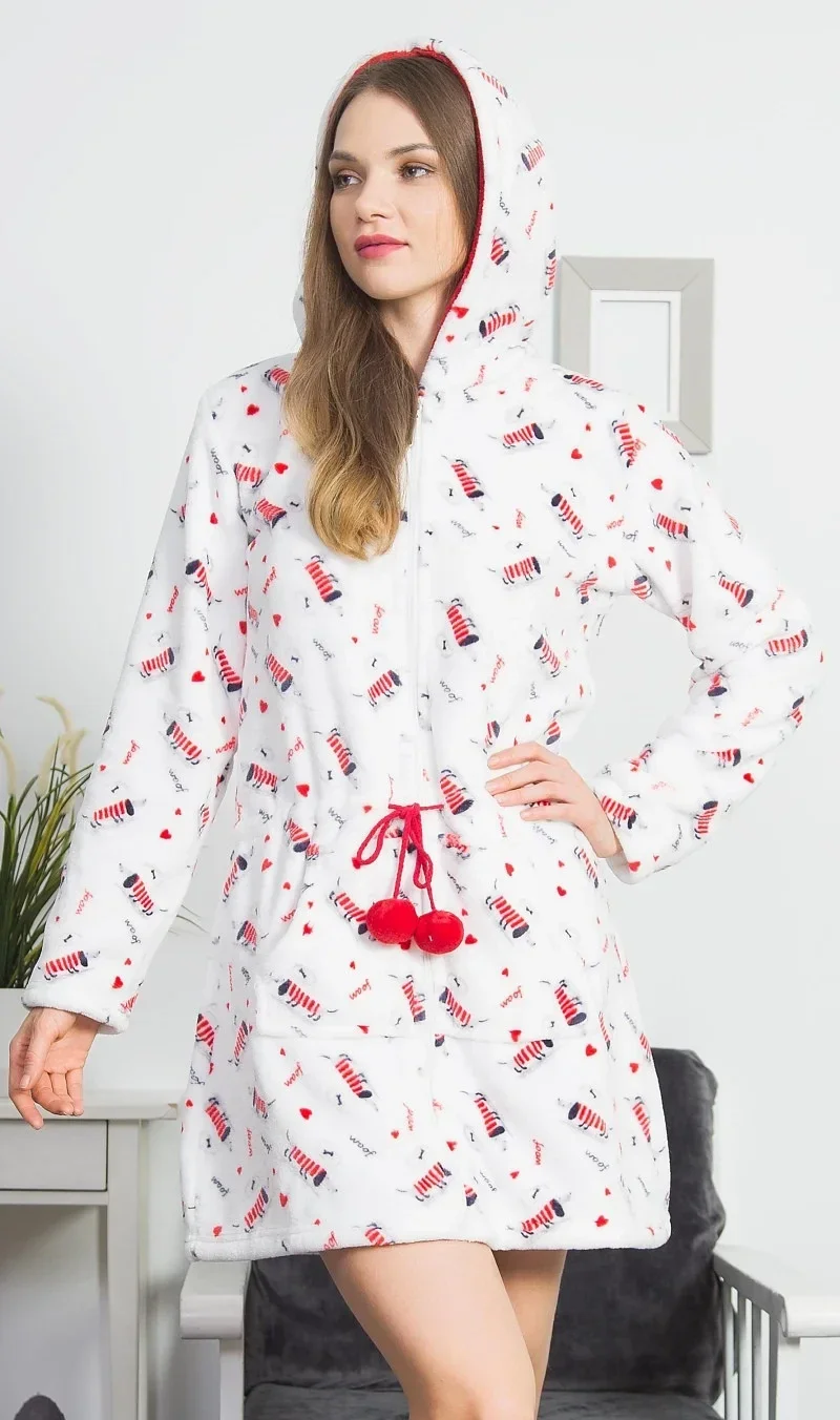Dámský krátký softový župan s kapucí na zip Jezevčík. Krátký župánek je potištěn obrázky červenočerných jezevčíků, v pase má kontrastní stahovací šňůrku na zavazování s chlupatými kuličkami a praktické kapsy. Použitý softový materiál je jemný a poddajný na dotek, oceníte ho obzvlášť v chladných dnech.