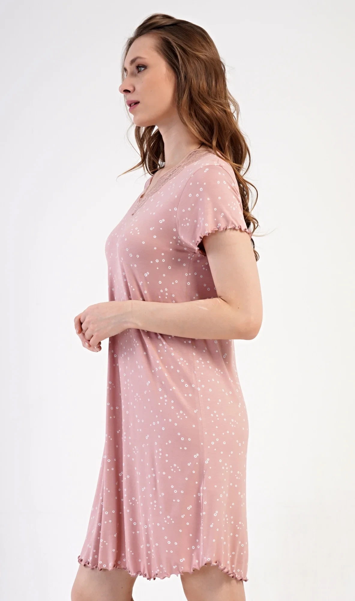 Dámská noční košile s krátkým rukávem Judita. Noční košile má příjemnou délkou nad kolena a ozdobné žlábkování okolo rukávů a spodního lemu. Výstřih je ozvláštněn jemnou krajkou. Košile s krátkým rukávem je potištěna drobnými kvítky. Použitý materiál ze směsi viskózy a lycry je příjemný a poddajný na dotek.