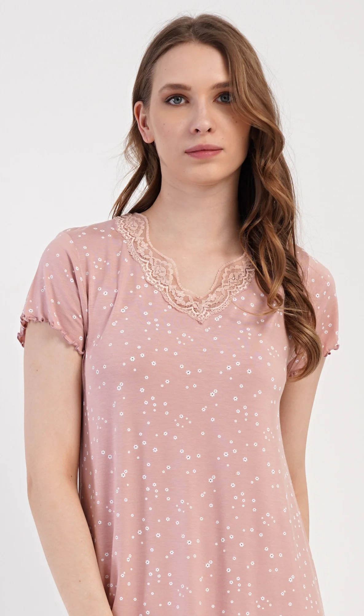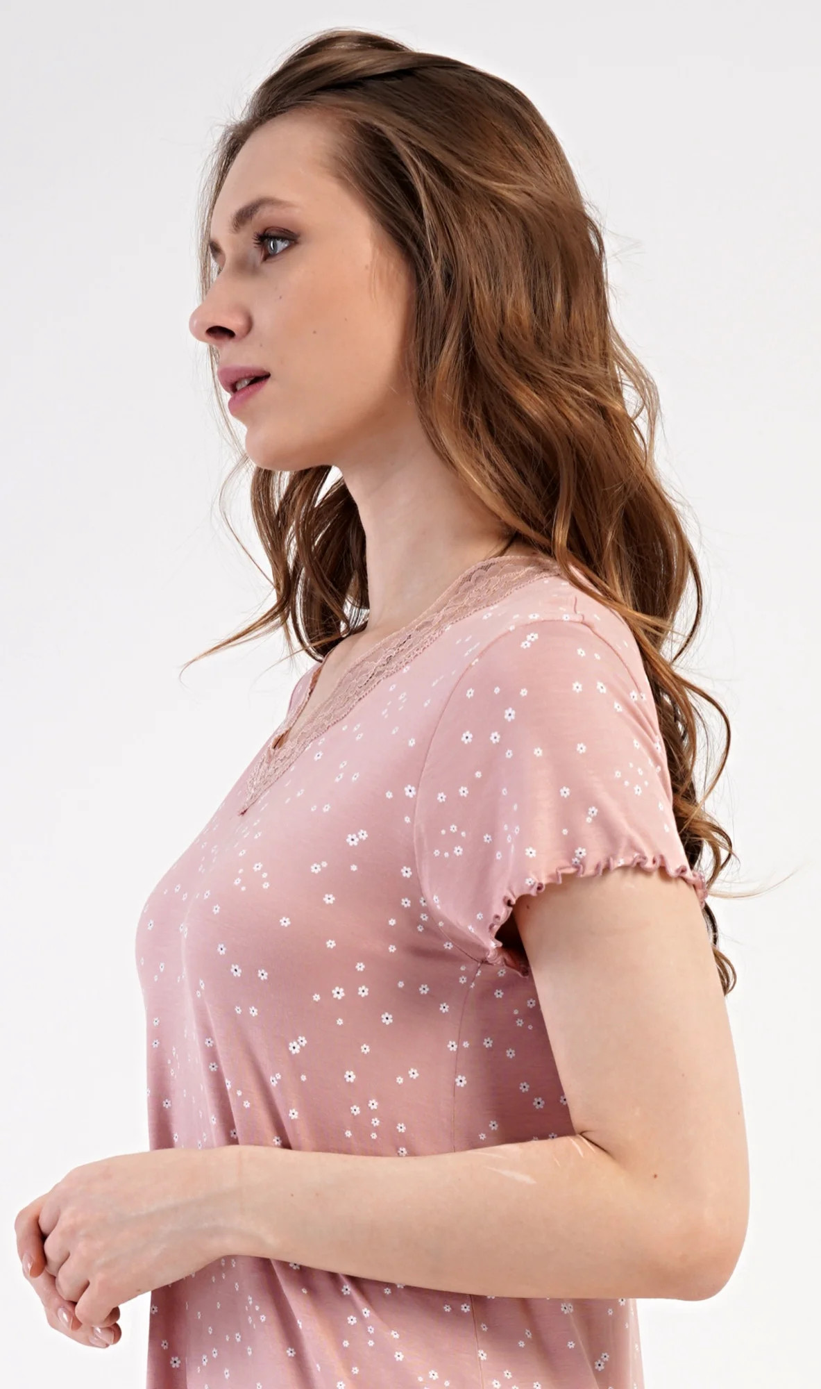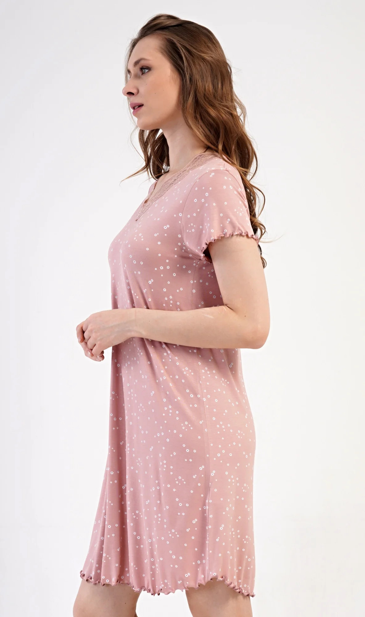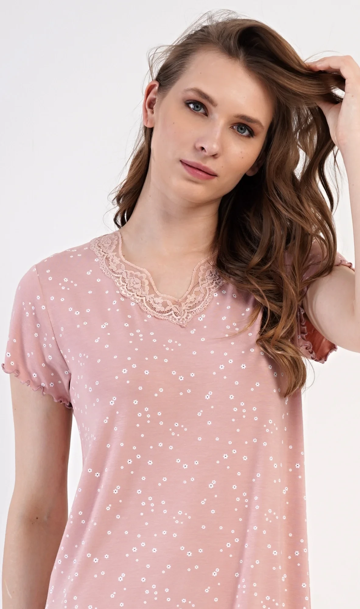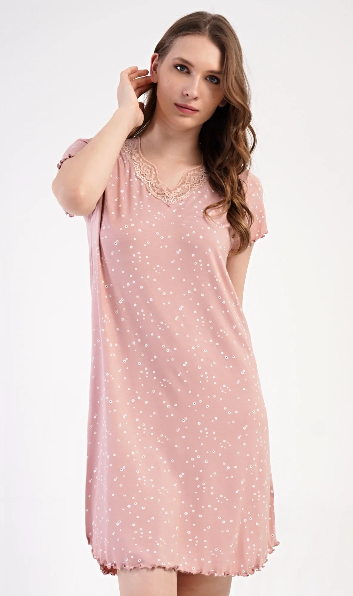 Dámská noční košile s krátkým rukávem Judita. Noční košile má příjemnou délkou nad kolena a ozdobné žlábkování okolo rukávů a spodního lemu. Výstřih je ozvláštněn jemnou krajkou. Košile s krátkým rukávem je potištěna drobnými kvítky. Použitý materiál ze směsi viskózy a lycry je příjemný a poddajný na dotek.