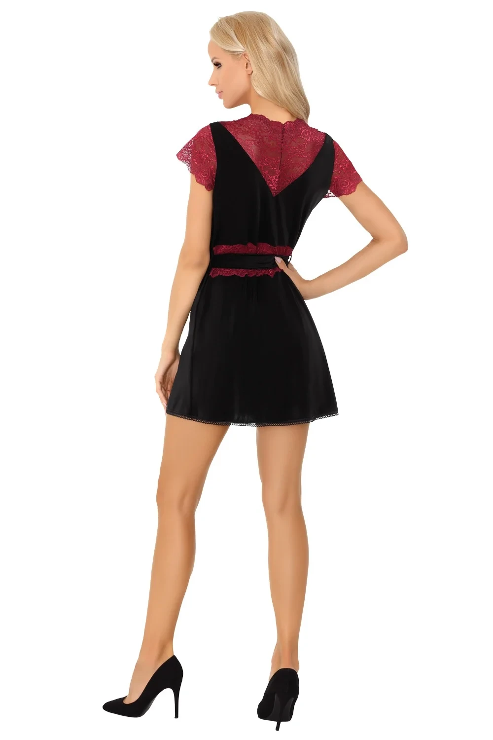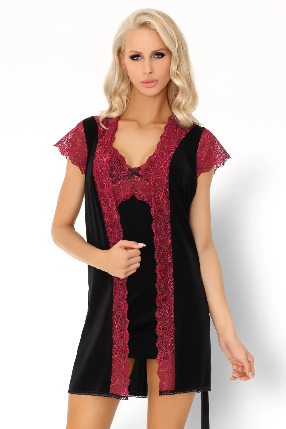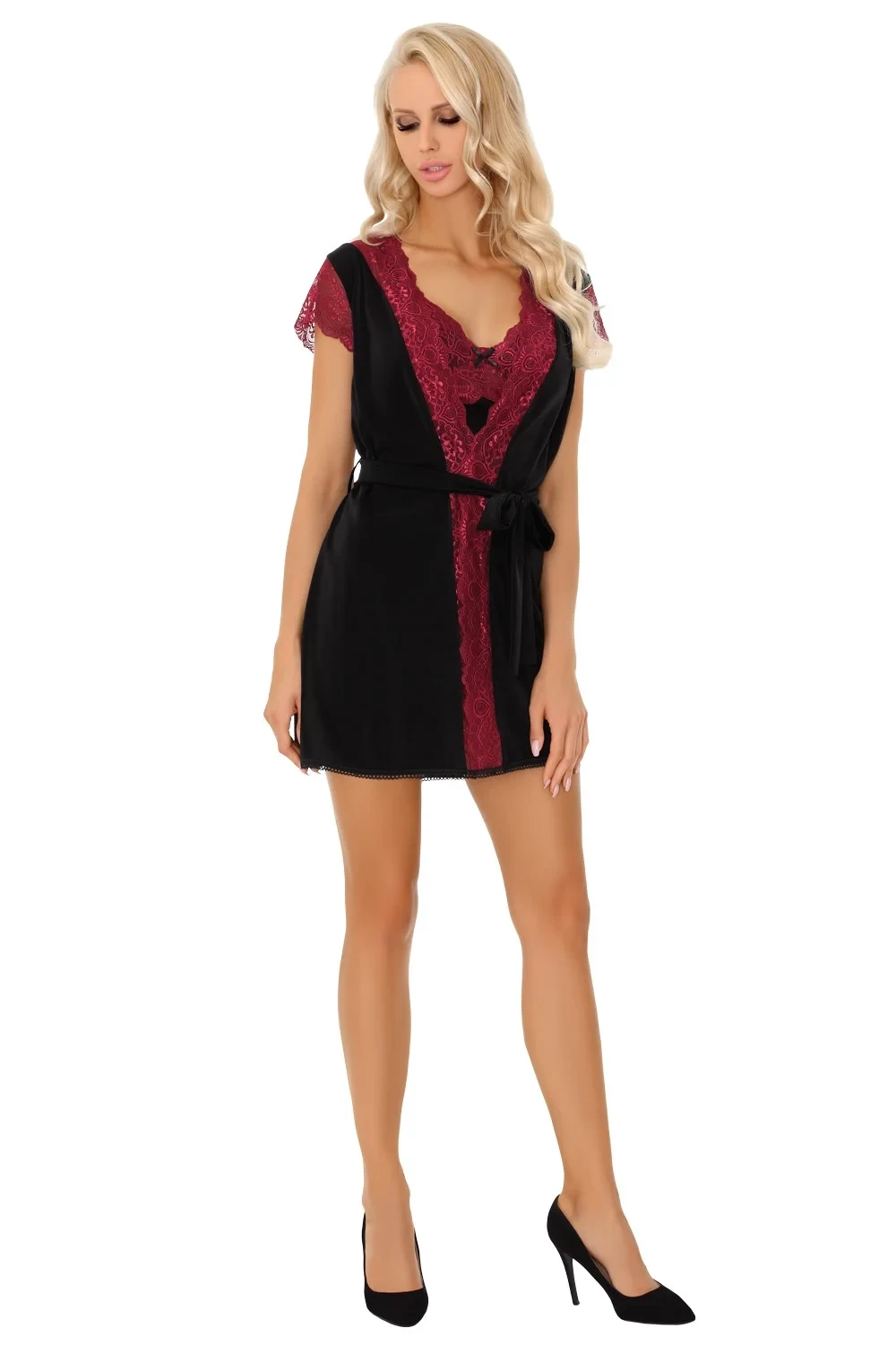 Dámský župan Kumiko Livco - z černého příjemného materiálu na dotek - vnitřní strana a rukávky jsou z tmavě růžové krajky - zavazování na pásek - délka nad kolena