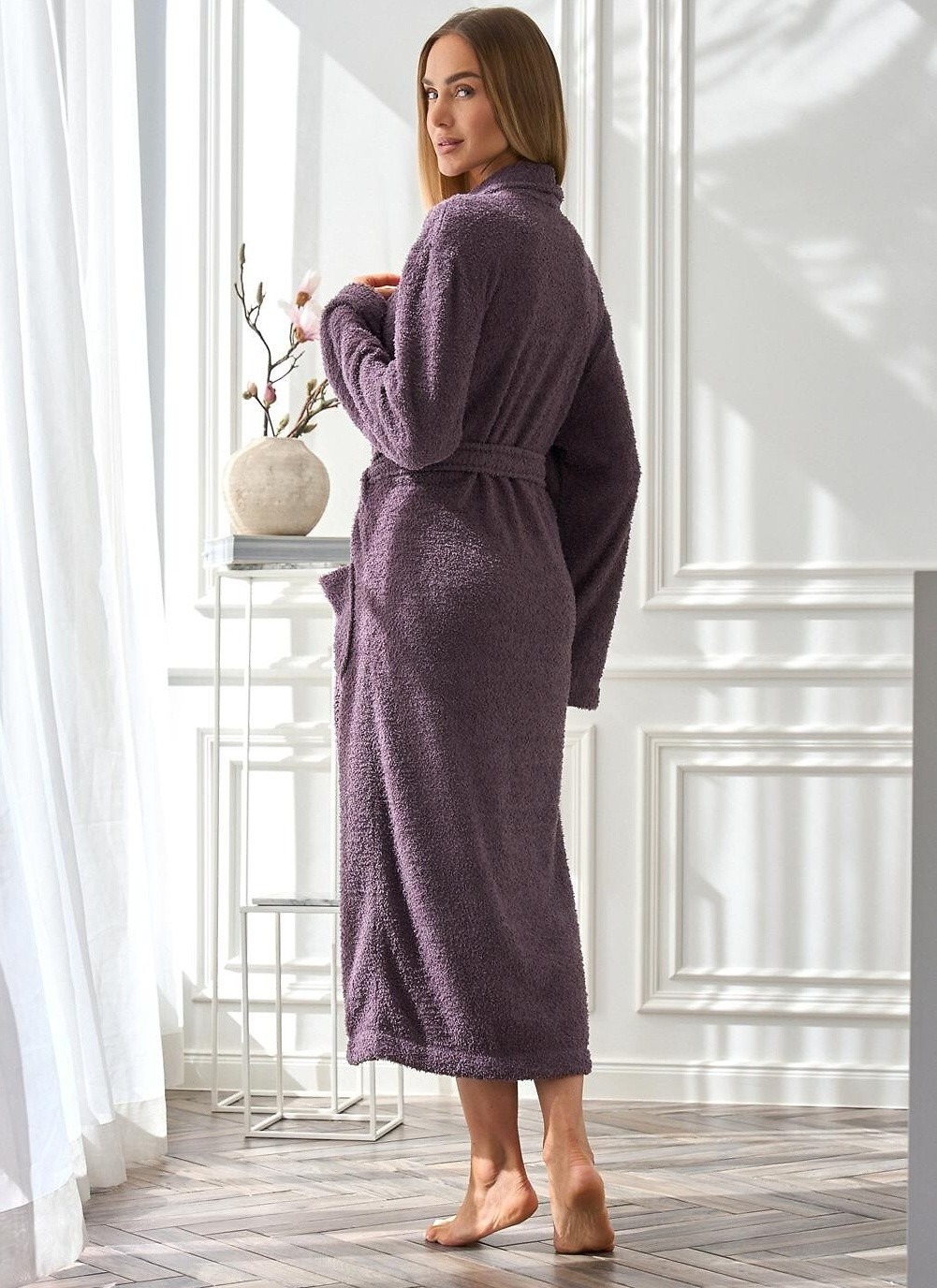 Dámský župan značky L&L. Župan je dlouhý pod kolena a na bocích má hluboké kapsy. Župan lze okolo pasu uvázat páskem. Župan je velmi příjemný na dotek.