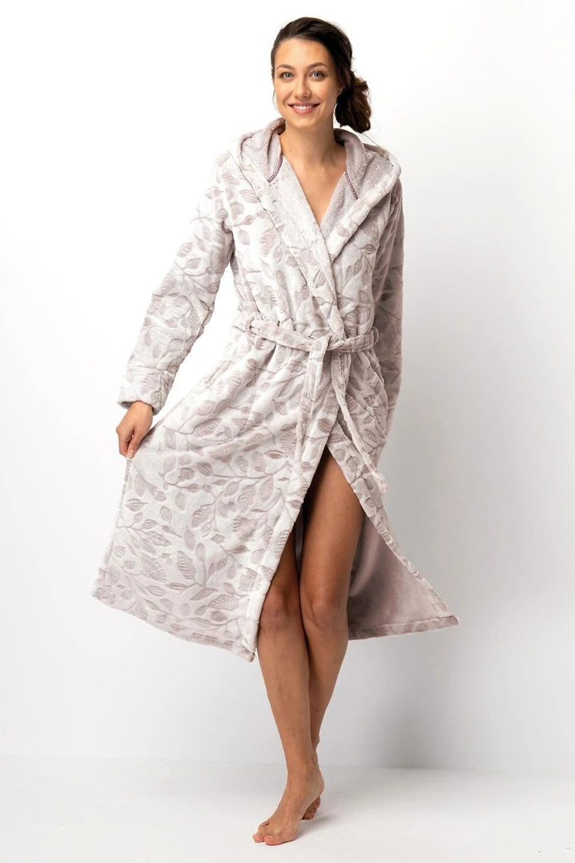 Szlafrok damski LGL 545 B25 to wyjątkowe połączenie wygody i subtelnej elegancji. Wykonany z niezwykle miękkiej dzianiny, doskonale otula ciało i zapewnia komfort w domowym zaciszu. Model został ozdobiony wytłaczanym, roślinnym motywem, który nadaje mu delikatnego i kobiecego charakteru. Posiada praktyczny kaptur, który chroni przed chłodem i dodaje całości przytulności. Wiązanie w pasie pozwala na idealne dopasowanie do sylwetki, a kieszenie na wysokości bioder zwiększają funkcjonalność. Szlafrok o długości do kolan sprawdzi się doskonale zarówno o poranku, jak i wieczorem.