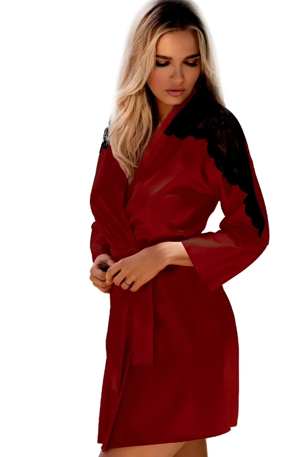 Luxusní saténový župan Marion Dkaren - dlouhé rukávy s krajkou - v pase vázáni na stužku - délka nad kolenaMateriálové složení: 100% polyester