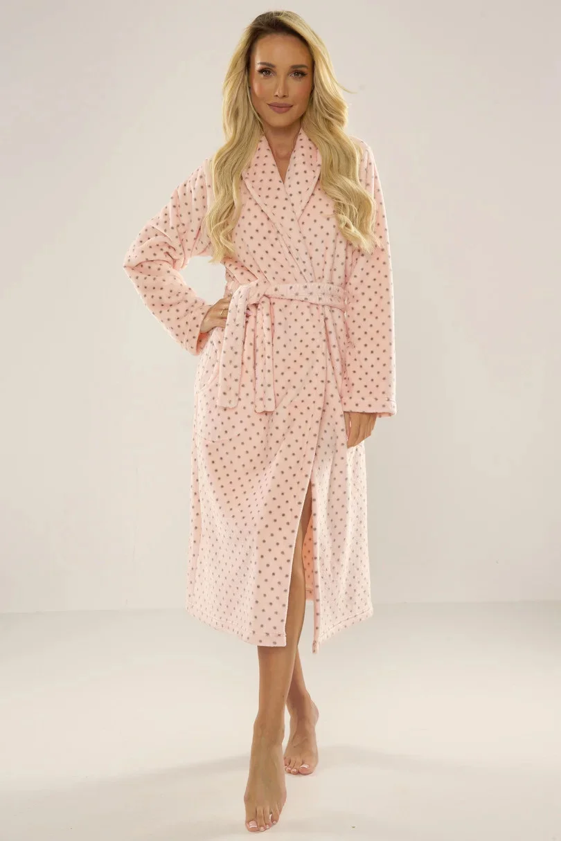 Dlouhý dámský župan, který je vyrobený z puntíkované tkaniny typu "soft".