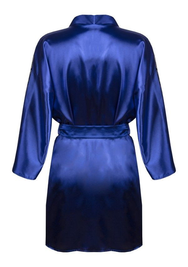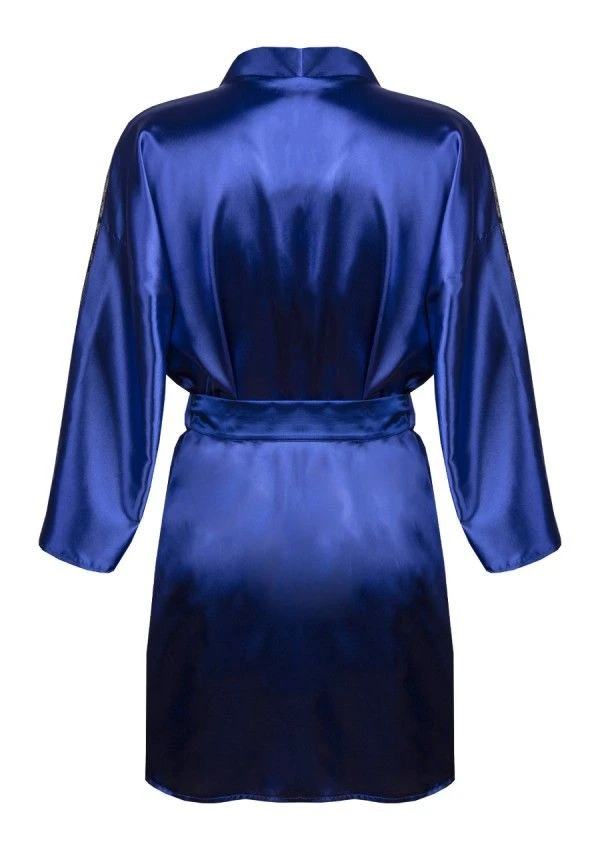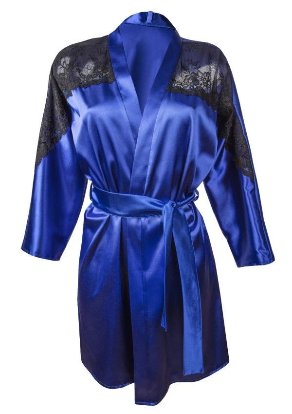 Smyslné negližé v tmavě modré barvě (modrak). Vyrobeno z elegantního hladkého saténu. Bohatě zdobené luxusní černou krajkou na ramenou a rukávech. Střih vzdušný, klasický, krásný. Univerzální délka do poloviny stehen. Složení: 100% polyester.