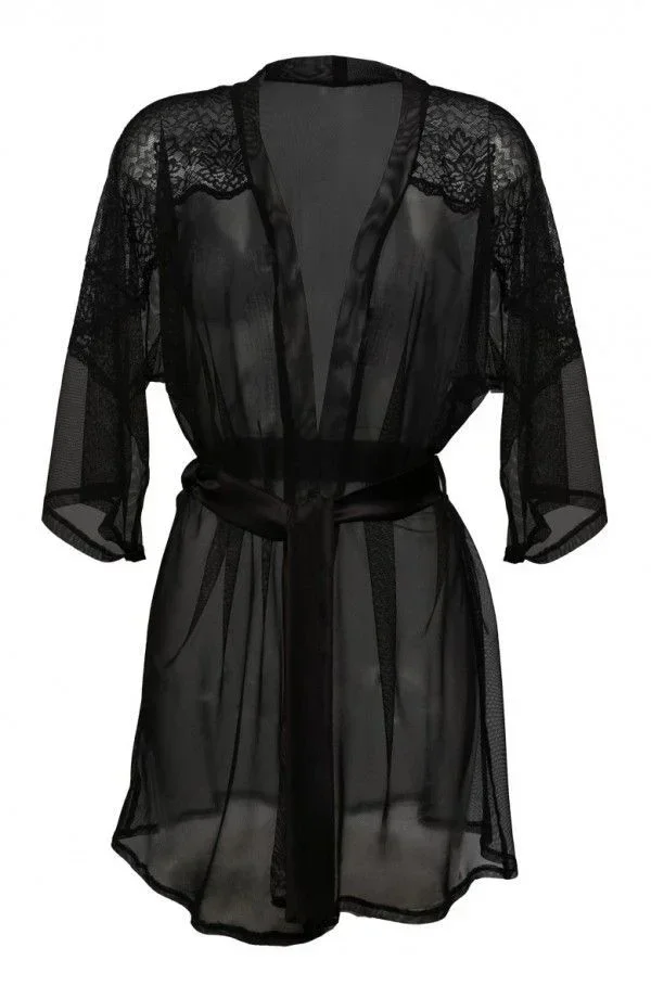 Vzdušný, velmi ženský župan typu negližé. Je vyrobena z černého elastického tylu a lehce přiléhá k postavě. Krajkové vsadky na ramenou, zavazování v pase na pásek z černého saténu. Plná krása a půvab! Složení: 100% polyester.