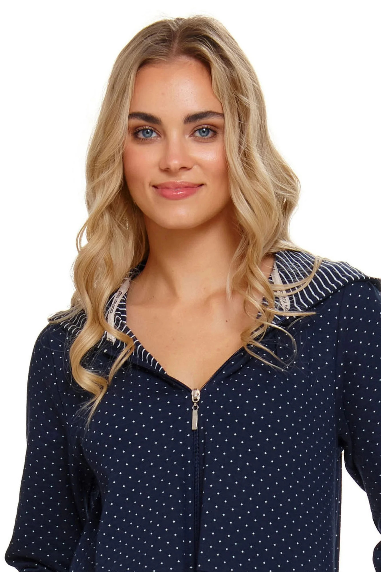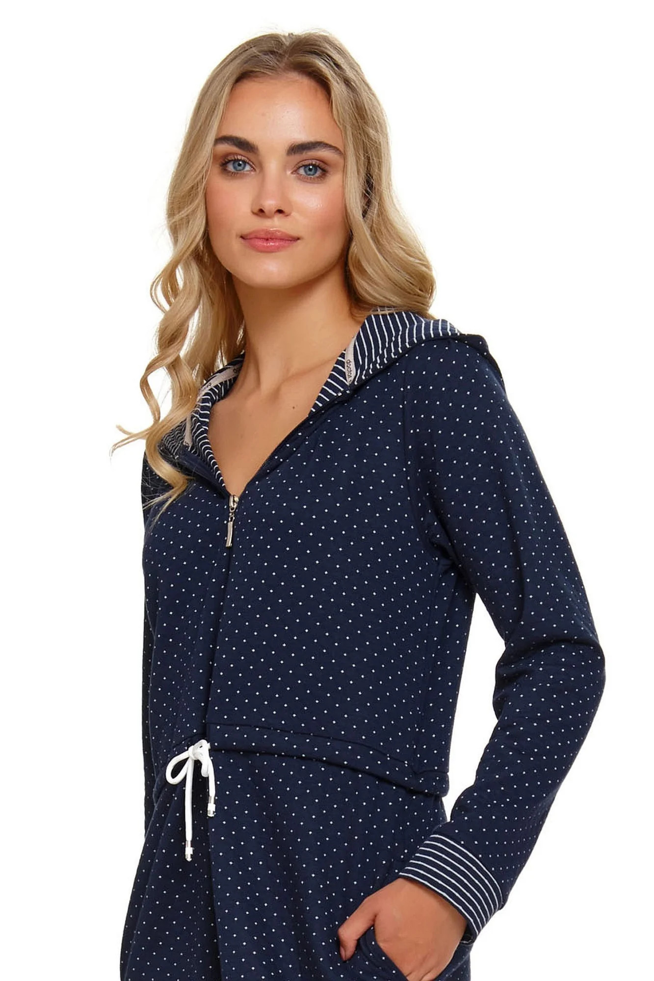 Dámský župan 5241 blue Doctornap - tmavě modrá barva - s bílými puntíky - vyrobený z velmi kvalitní a příjemné bavlny - dlouhé rukávy - vázání v pase - s kapucí - manžety a kapuce zdobené proužky - délka nad kolena - certifikát OEKO-TEX Standard 100