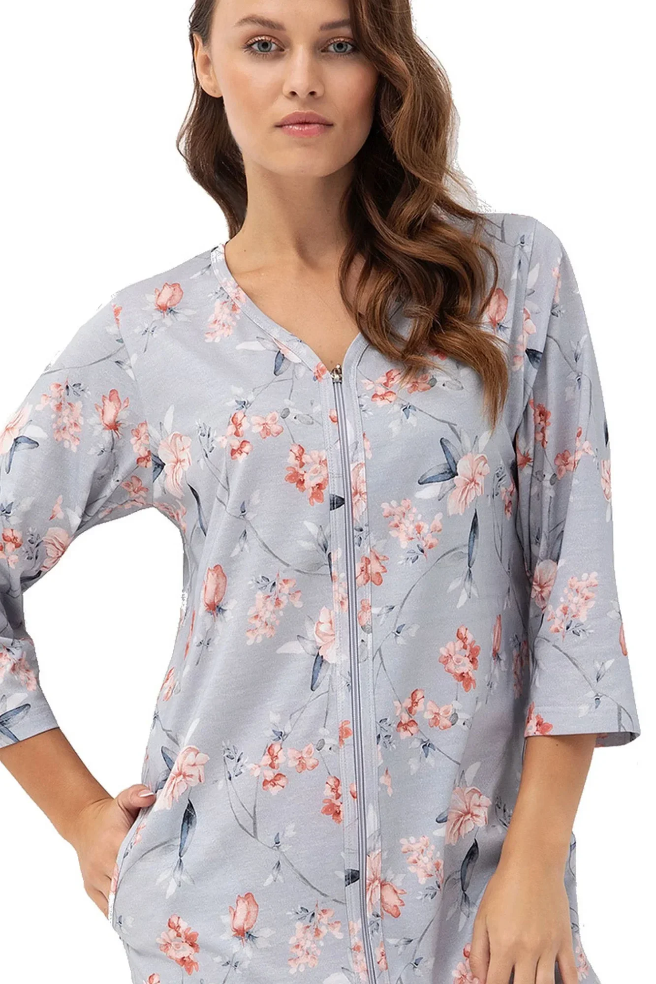 Dámský župan 392 grey Luna - šedá barva - z vysoce jakostní bavlny - se vzorem - tříčtvrteční rukávy - zapínání na zip - s kapsamiMateriálové složení: 100% bavlna