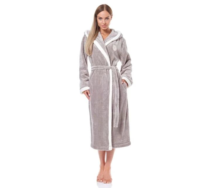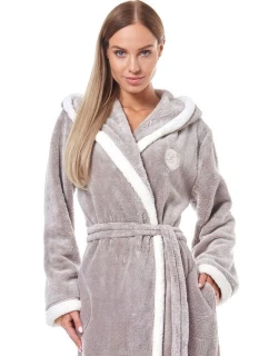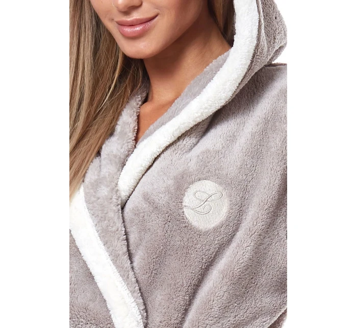 Dámský župan 9133 beige L&L - béžová barva - z měkkého materiálu typu soft - na bocích kapsy - zdobené nášivkou na přední straně - zavazování v pase na pásek - kontrastní lemování - s kapucí - krátkýMateriálové složení: 100% polyester
