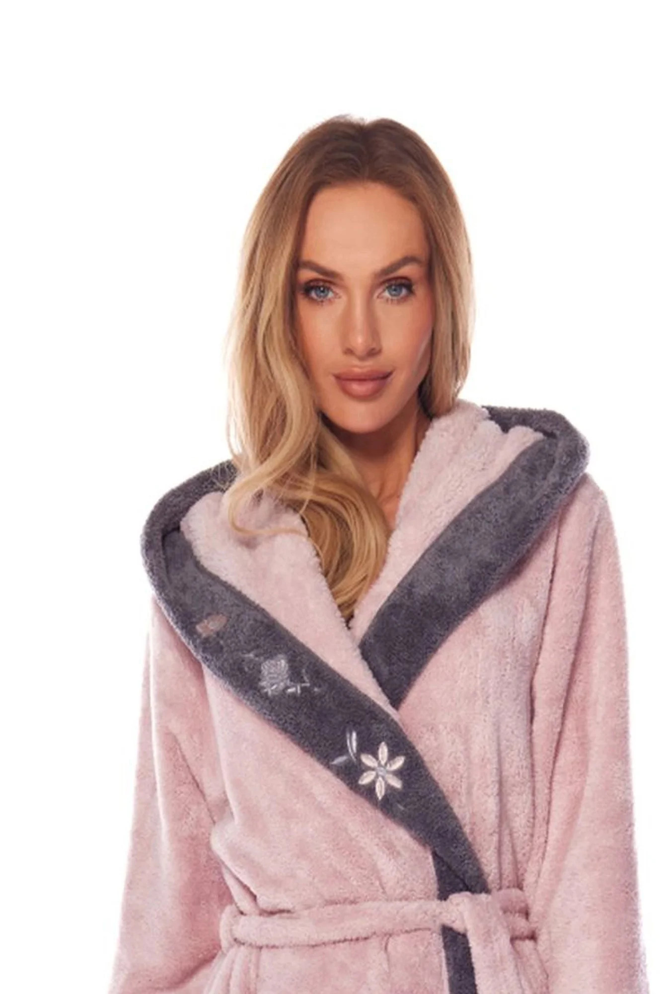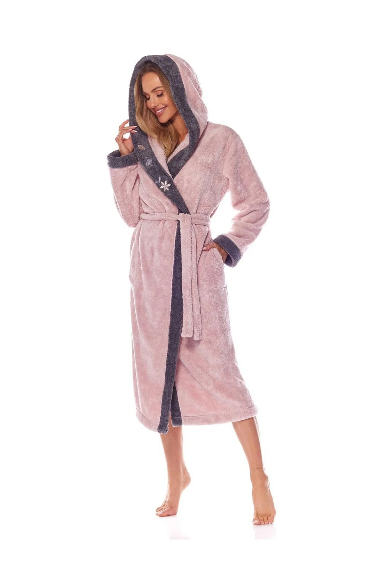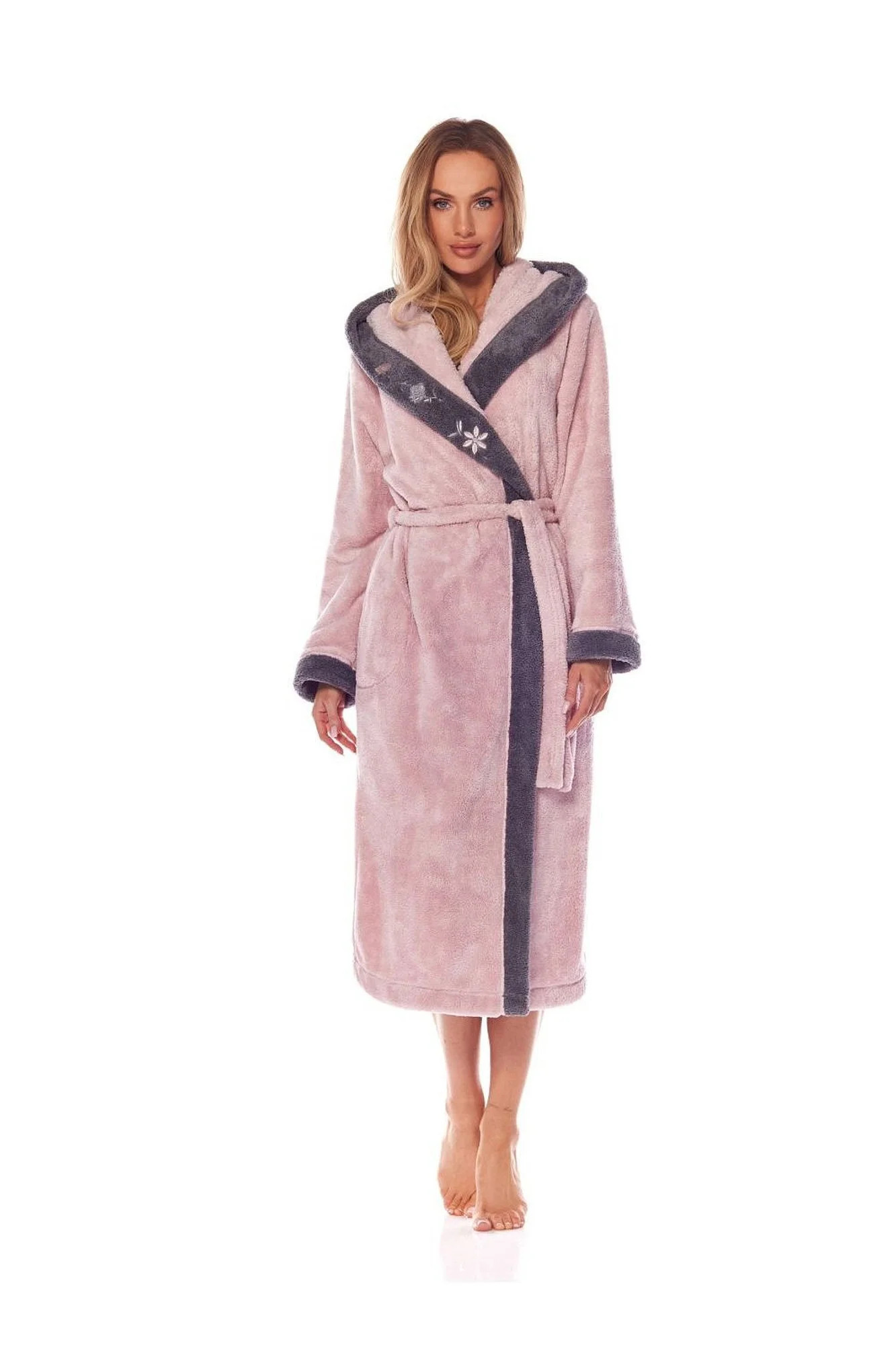 Župan je vyrobený z bavlněné tkaniny, na bocích má kapsy a v pase se zavazuje.