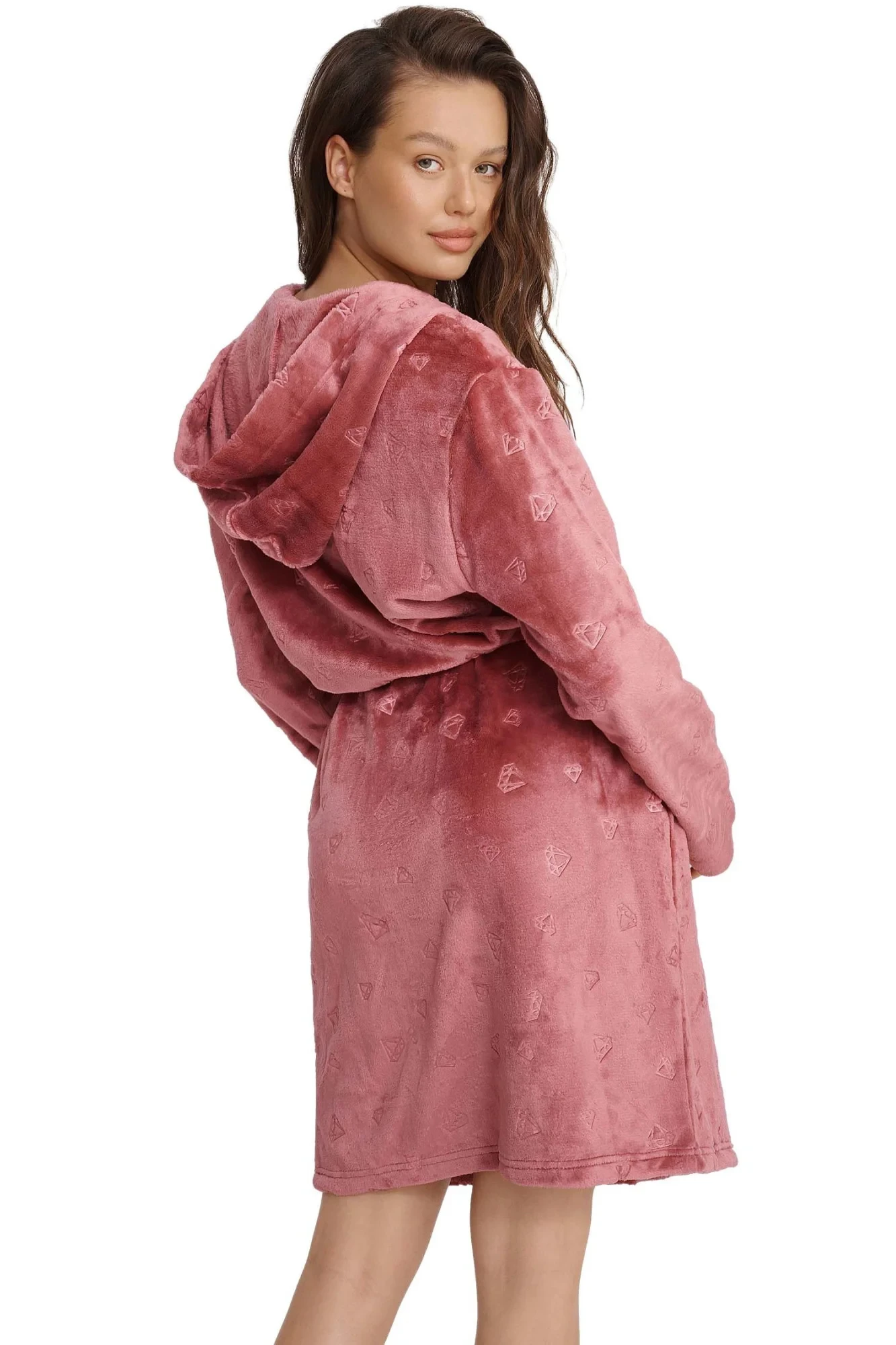 Dámský župan 41066 Glossy Henderson - materiál příjemný na dotek - starorůžová barva se vzorem - s kapucí - s kapsami - na zavazování - délka nad kolenaMateriálové složení: 100% polyester