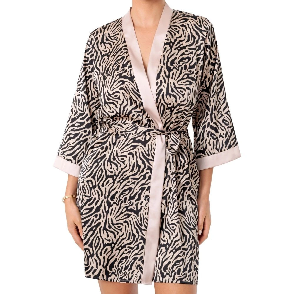 Dámský župan Sheila Donna - béžová barva - z jemného saténu - se zvířecím motivem - tříčtvrteční rukávy - béžové lemování - zavazování v pase na pásek