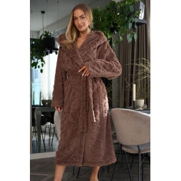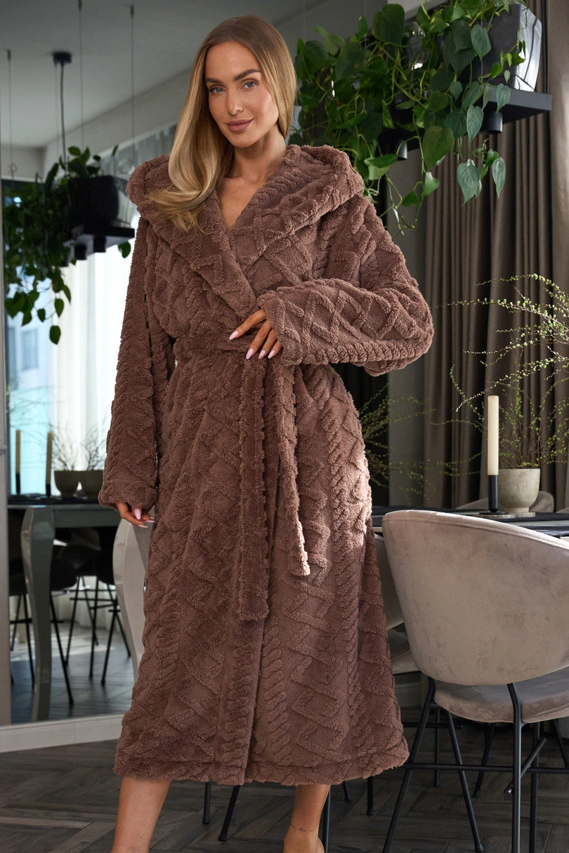Szlafrok damski długi 2402 to komfortowa propozycja dla kobiet, które cenią ciepło i wygodę w domowym zaciszu. Wykonany z miękkiej dzianiny o wytłaczanym, wypukłym wzorze, doskonale otula ciało, zapewniając przyjemne ciepło nawet w chłodniejsze dni. Kaptur, długi rękaw i wiązanie w pasie gwarantują funkcjonalność i wygodę, a kieszenie na biodrach sprawiają, że szlafrok jest również bardzo praktyczny. Jego długa forma nadaje mu elegancji i pozwala na pełne okrycie. Idealny zarówno po kąpieli, jak i do codziennego relaksu w domu.