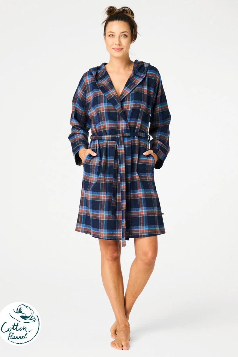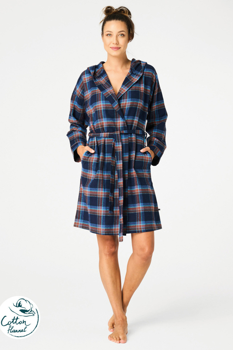 Měkký a příjemný dámský župan z kvalitního bavlněného flanelu, který zahřeje a je pohodlný za chladných rán a večerů.Model s kapucí, zavazováním v pase na pásek, s praktickými kapsami na bocích.Tmavomodrý kostkovaný vzor s hnědými akcenty dodává nadčasový, elegantní nádech.Ideální pro nošení po koupeli, doma nebo na líné víkendy.