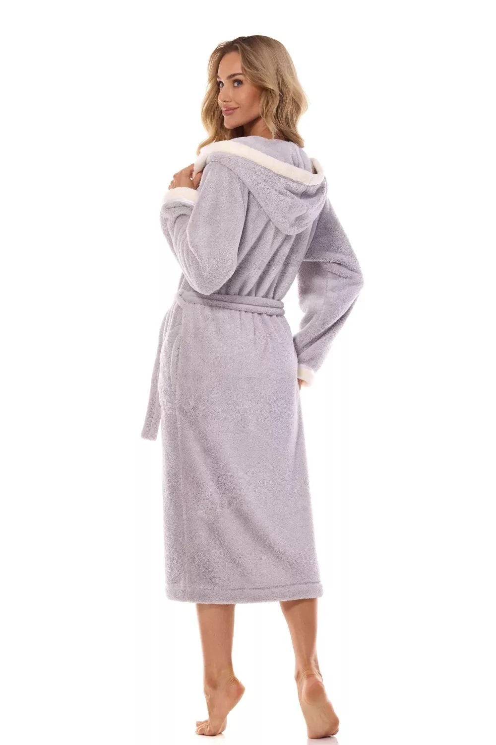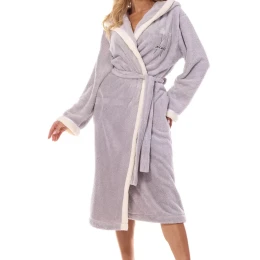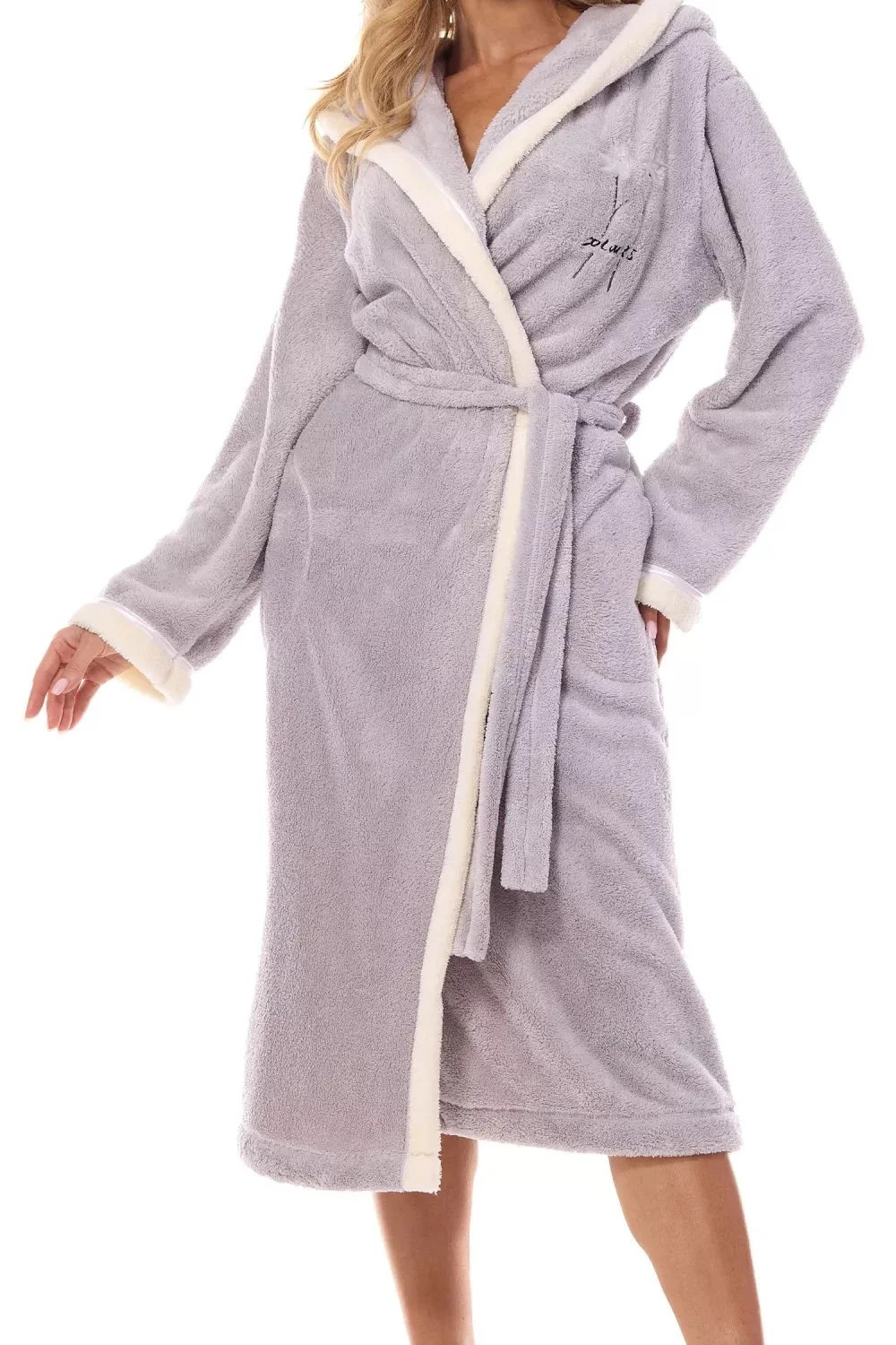 Dámský župan 2419 Tess crystal plus L&L - šedá barva - z měkkého materiálu typu soft - na prsou ozdobná výšivka - kapsy a v pase vázání na pásek - kontrastní lemování - s kapucí - dlouhý