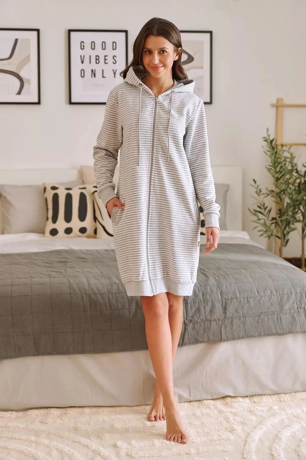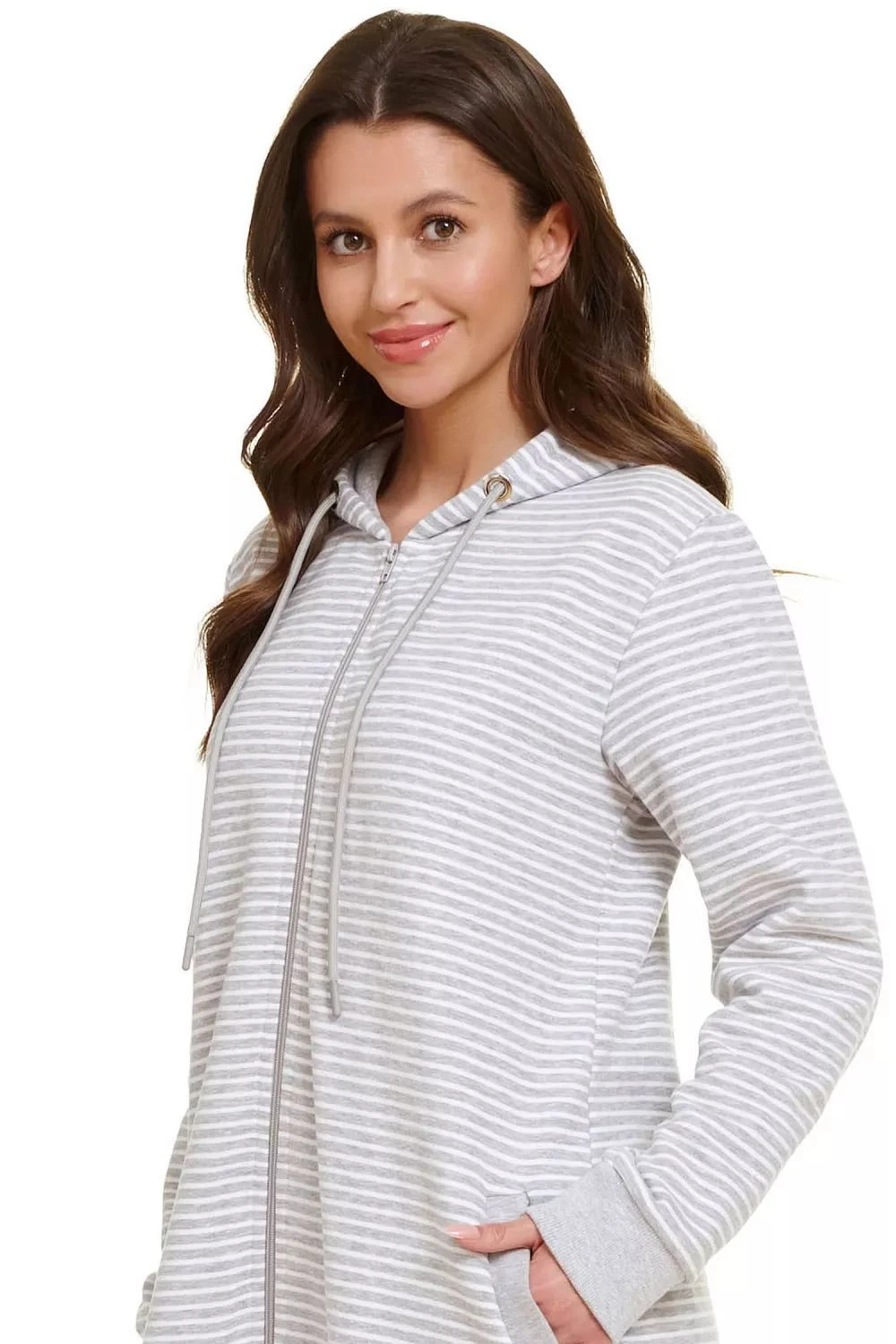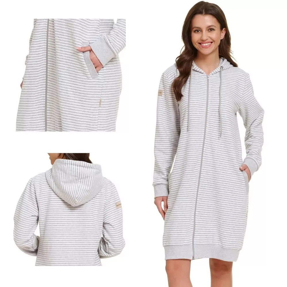 Dámský župan 5246 plus Doctornap - šedá barva - z vysoce jakostní bavlny - s pruhy - zapínání na zip - s kapucí - s kapsami - rukávy a spodní lem zakončené efektním lemem - délka nad kolena - certifikát OEKO-TEX Standard 100