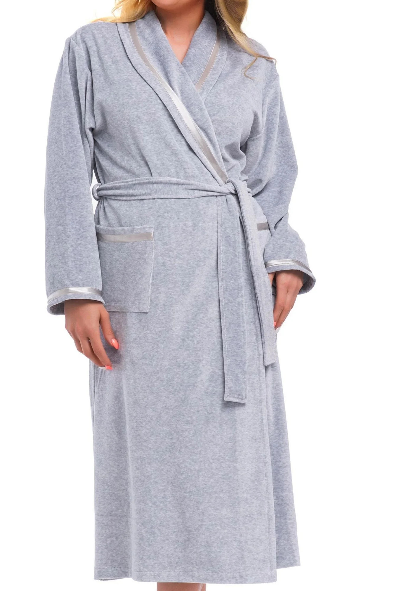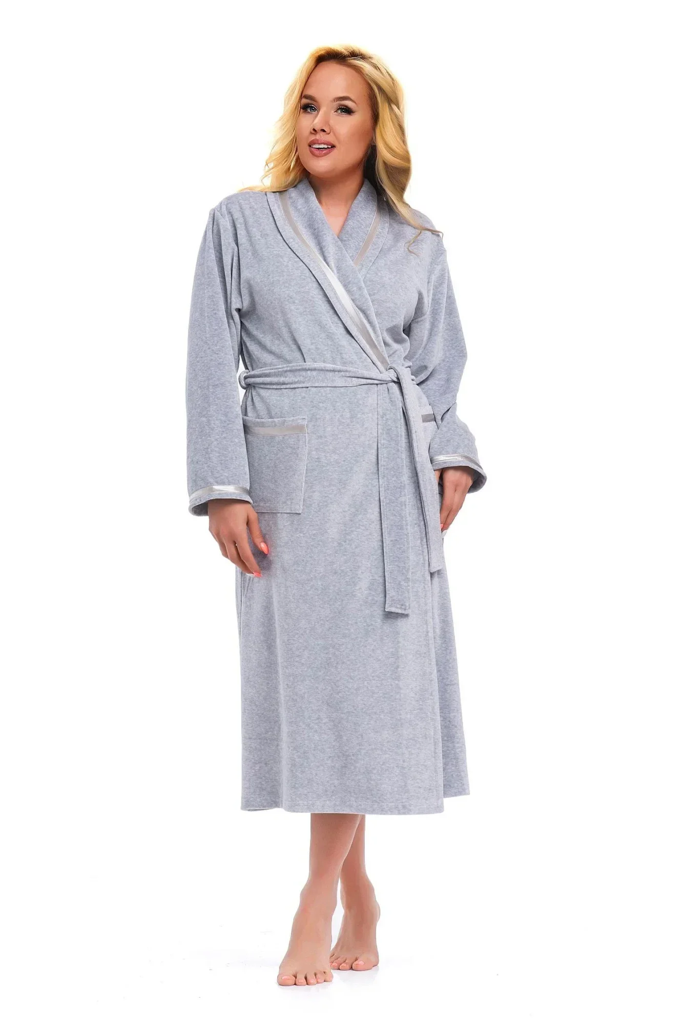 Dámský župan 1078 grey plus Doctornap - šedá barva - z vysoce jakostní bavlny - dlouhé rukávy - na zavazování v pase - antibakteriální, protiplísňové a termoregulační vlastnosti - délka pod kolena