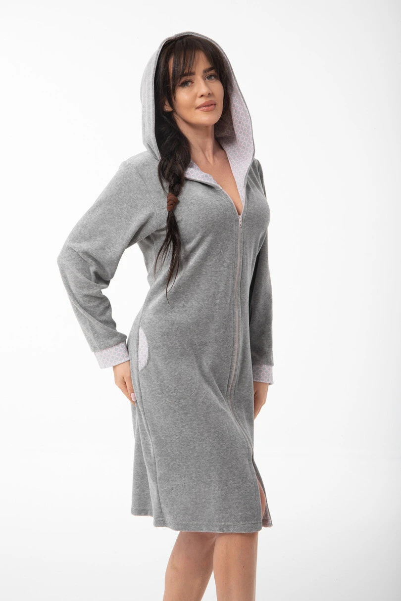 Dámský župan na zip s kapucí z bavlny s příměsí polyesteru. Kapuce a rukávy zakončené kontrastní látkou. Kapsy na bocích.