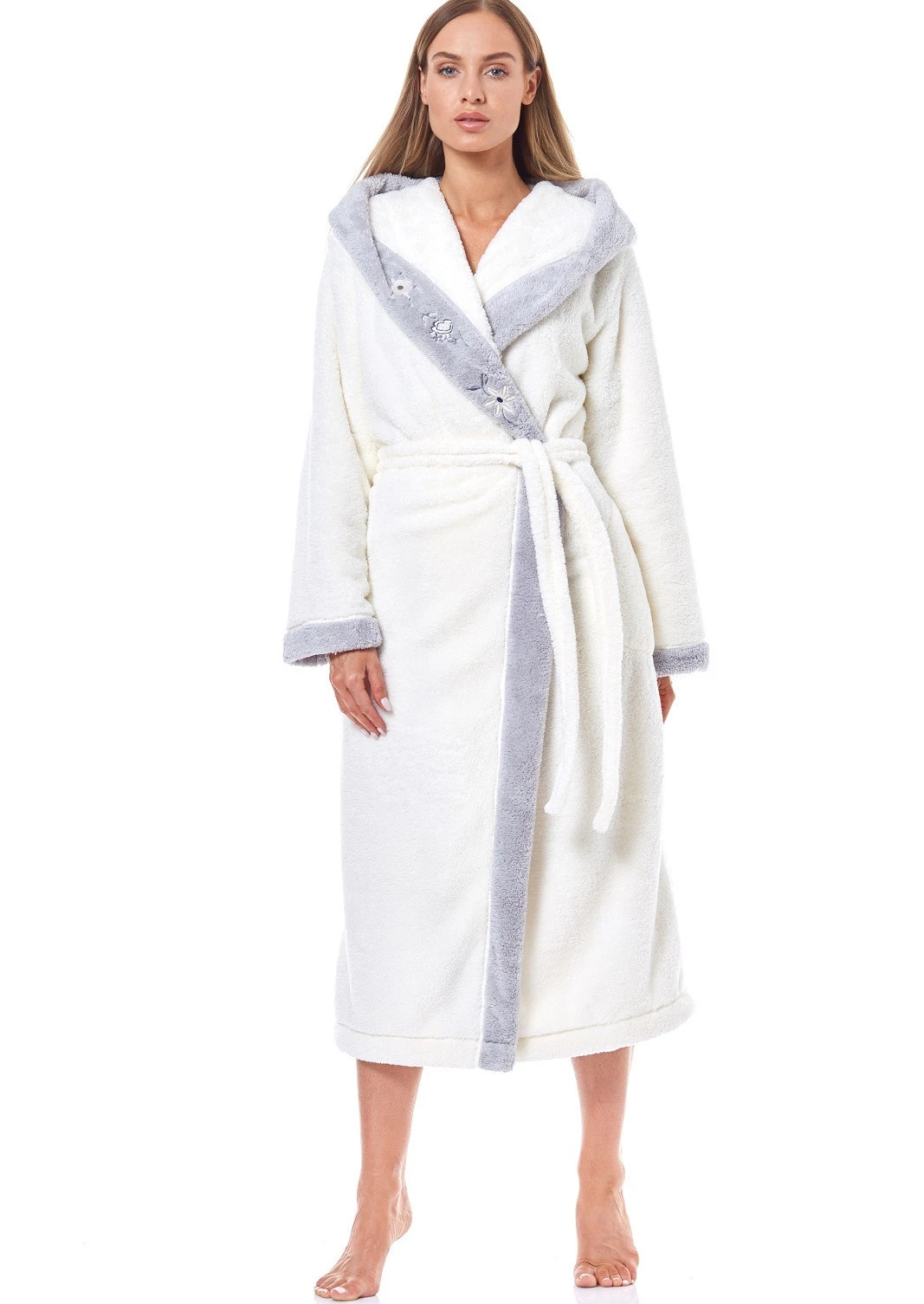 Dámský župan s kapucí značky L&L. Župan je dlouhý pod kolena. Na bocích jsou zapuštěné kapsy. Župan lze okolo pasu uvázat páskem. Župan je velmi příjemný na dotek.
