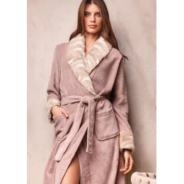 Mimořádně jemný a hřejivý dlouhý župan v romantickém odstínu světle hnědé, který okouzlí kombinací nadýchaného materiálu a elegantního vzhledu. Límec a manžety jsou lemované měkkou umělou kožešinkou pro ještě větší komfort. Model se zavazuje páskem v pase a je doplněn prostornými kapsami. Délka ke kotníkům zajišťuje dokonalé zahřátí i během nejchladnějších dnů.