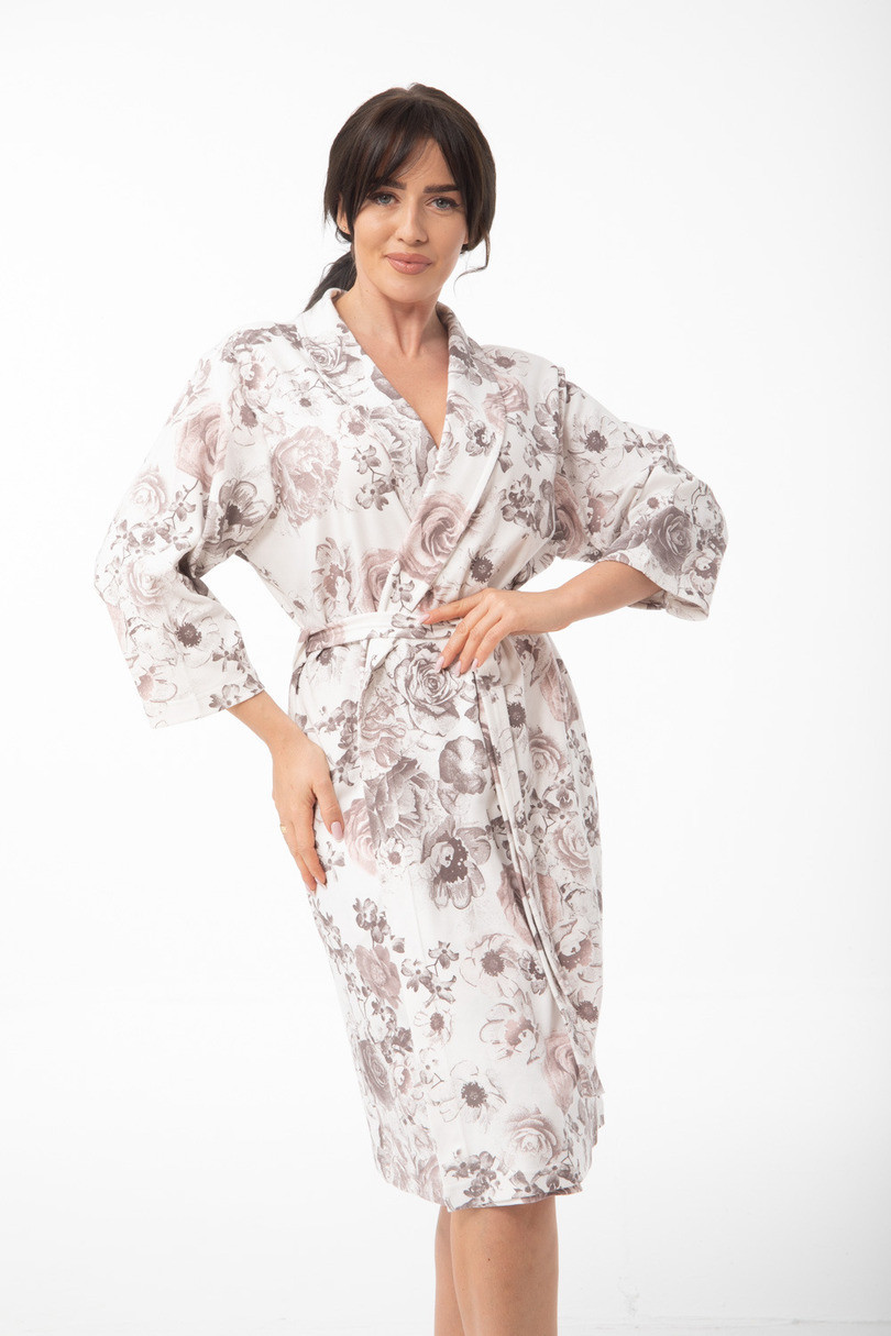 Dámský župan, který je ušitý z tenké bavlny s květinovým vzorem.